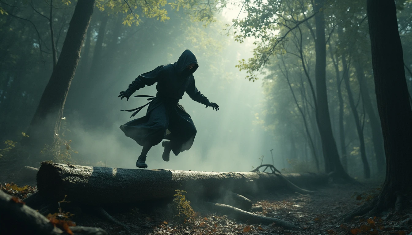 A stealthy shadow ninja leaping over a fallen log, dense misty rainforest background, dappled sunlight filtering through canopy, early morning atmosphere, hyper-realistic digital painting, muted color palette with emphasis on grays and blacks, ultra high definition, cinematic 8k UHD. The air is heavy with an unsettling silence, as if the forest itself is holding its breath in anticipation of the ninja's next move. The dappled sunlight creates long, ominous shadows that stretch across the forest floor, while the mist swirls around the fallen log like a malevolent entity. The ninja's face remains obscured by their black hood, adding to the sense of mystery and foreboding.