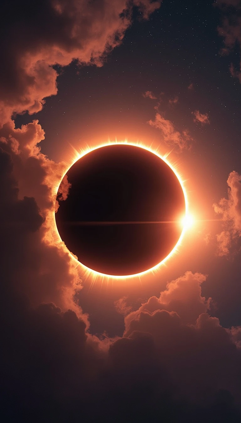 A bright ring of light forming around the black disk of the Moon, which completely blocks out the solar disk, leaving only a glowing ring. This ring should be bright and saturated, with shades of yellow, orange and red, creating the effect of a ring of fire. Coronal flares are visible around the ring, which emit bright rays of light, like rays of sunlight breaking through clouds. The sky at the peak of the eclipse exhibits unique atmospheric phenomena: light clouds tinged with pink and purple tones create a soft light effect, and stars begin to appear against the darkening sky, adding a sense of magic. The position of the Sun and Moon must be perfectly aligned to create the effect of a total annular eclipse, with the Moon positioned exactly between the Earth and the Sun. Include elements such as stars that begin to appear against the backdrop of the eclipse to enhance the beauty and majesty of this astronomical event.