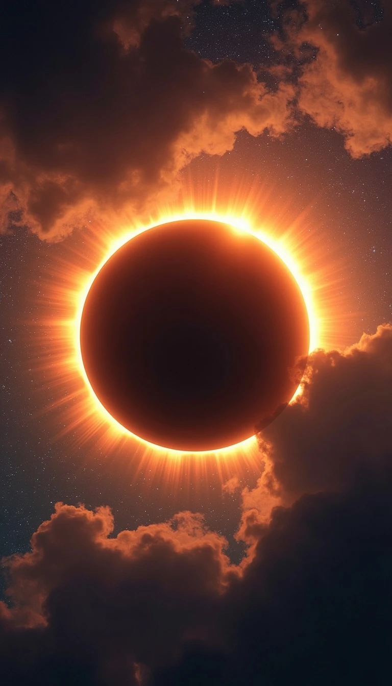 A bright ring of light forming around the black disk of the Moon, which completely blocks out the solar disk, leaving only a glowing ring. This ring should be bright and saturated, with shades of yellow, orange and red, creating the effect of a ring of fire. Coronal flares are visible around the ring, which emit bright rays of light, like rays of sunlight breaking through clouds. The sky at the peak of the eclipse exhibits unique atmospheric phenomena: light clouds tinged with pink and purple tones create a soft light effect, and stars begin to appear against the darkening sky, adding a sense of magic. The position of the Sun and Moon must be perfectly aligned to create the effect of a total annular eclipse, with the Moon positioned exactly between the Earth and the Sun. Include elements such as stars that begin to appear against the backdrop of the eclipse to enhance the beauty and majesty of this astronomical event.