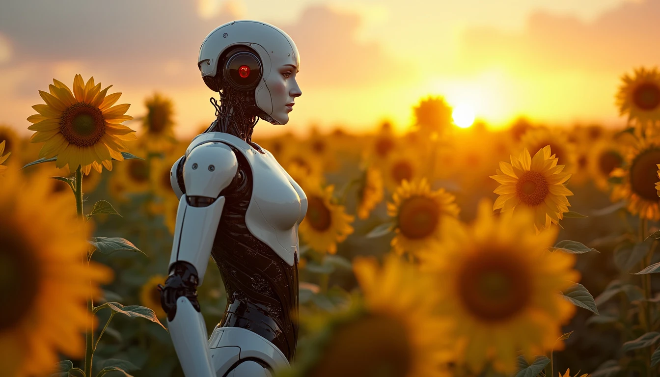 award-winning photography of a humanoid android in a sunflower field at sunset, in the style of nature, god rays, light beams, futuristic inspired , Shot on a kodak Gold 200 56mm f/1.6