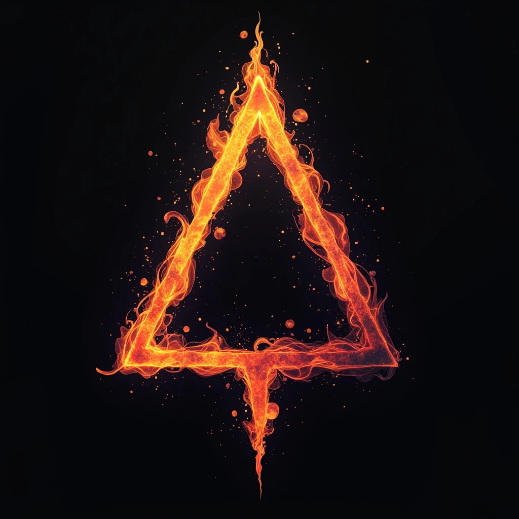 an angular symbol of a vertical line with a sideways triangle connected on the right in the form of an "S", in fiery colors on a black background