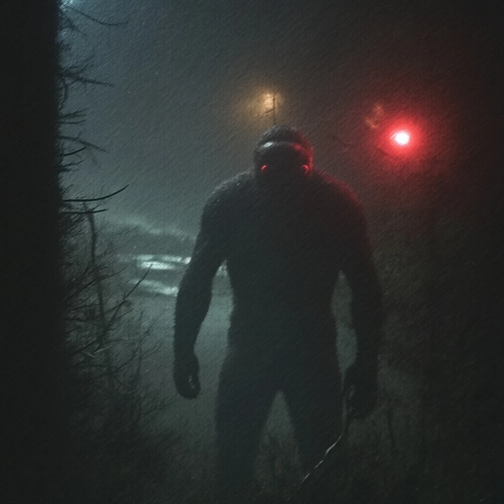 a very bad quality image from an old CCTV, pixelised, amator foutage, lot of noise and interferences, by night, low light, strange non human creature almost visible in a shadow, with red glowing eyes, weird, scary.
