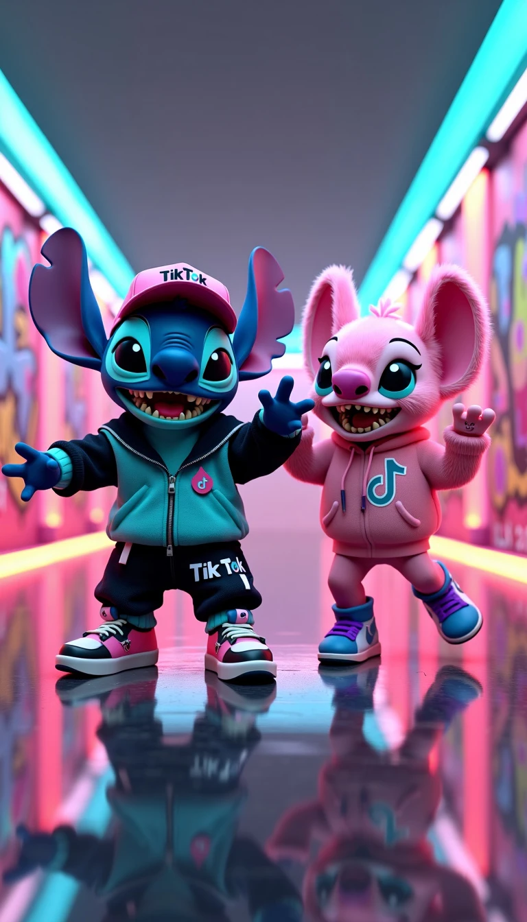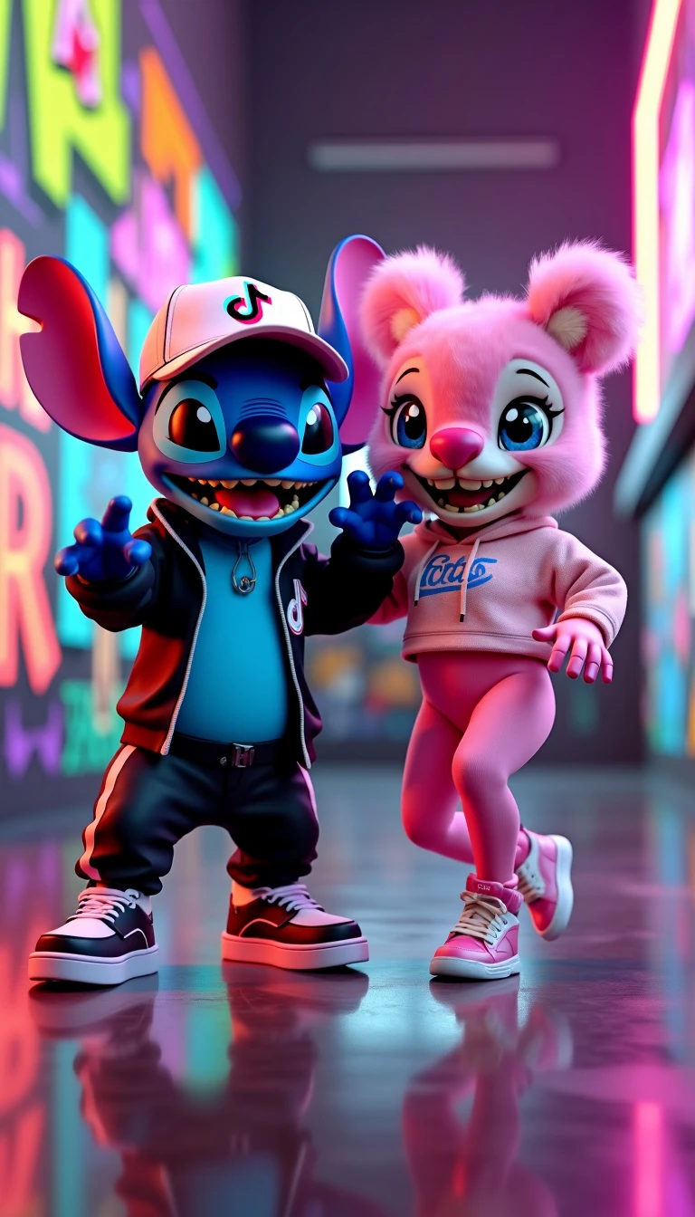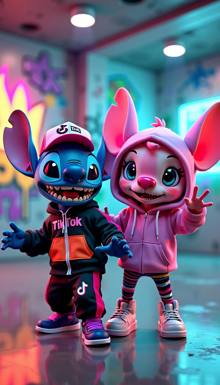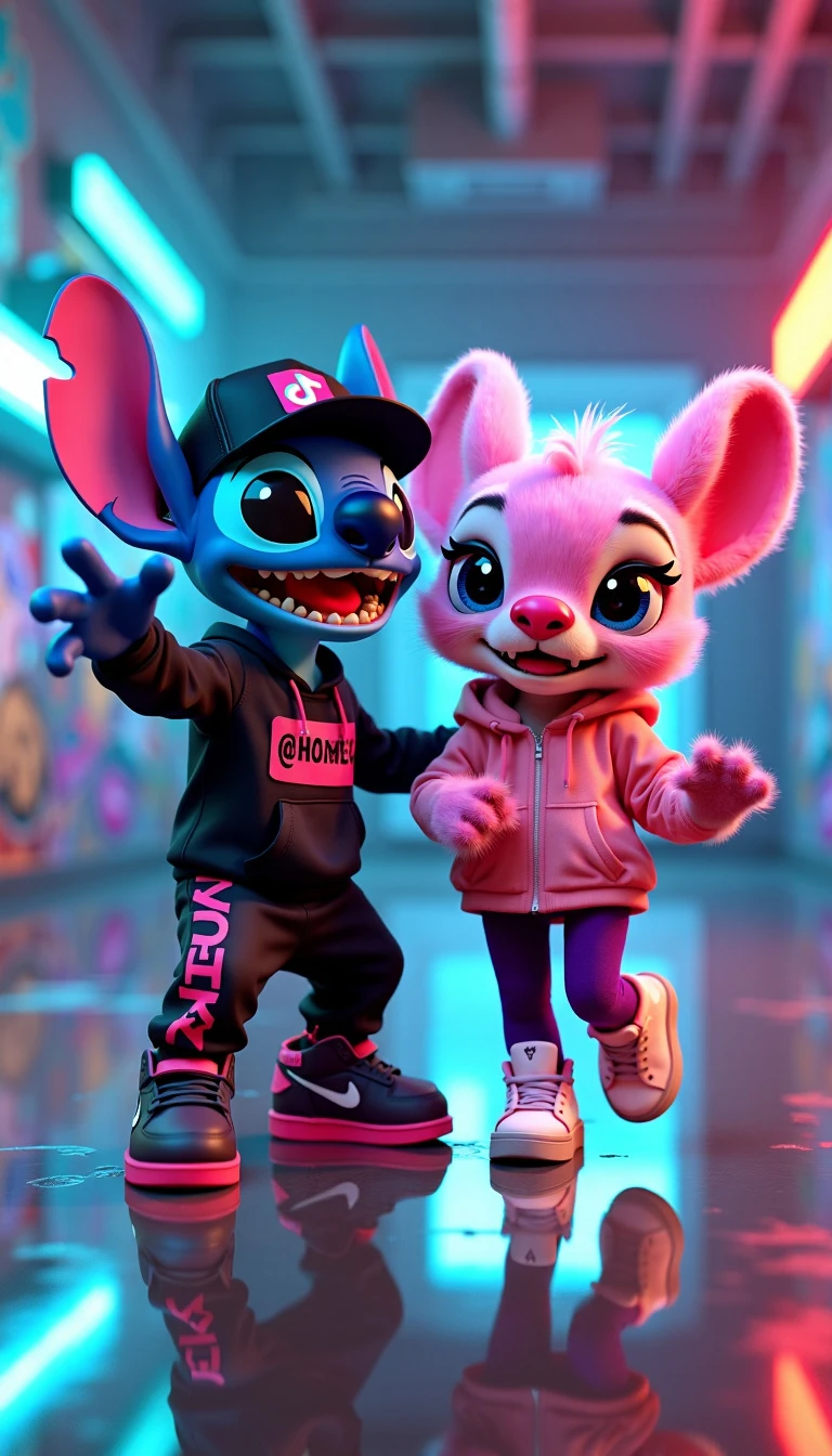 Create an **8K ultra-high-detail 3D-rendered image** featuring Stitch and **Angel (the pink version)** from *Lilo and Stitch*, both dressed in **modern urban streetwear**. Stitch is wearing a **TikTok-branded tracksuit** with **neon blue, black, and pink accents**, a **trucker hat with the TikTok logo**, and **high-top sneakers**, blending street style with a trendy vibe. His pose shows off his dance moves, as he spins in mid-motion with a mischievous expression. Angel, the **pink, fluffy character**, is dressed in **stylish, bright urban clothing**—a **cropped hoodie in soft pink with neon highlights**, paired with **fitted leggings** and **sleek sneakers**. Her outfit has modern touches of **purple and neon blue**, perfectly matching her fun, vibrant personality. She’s striking a playful, dynamic dance pose next to Stitch, with her ears bouncing as she grooves. The background is set in a **neon-lit, futuristic dance floor** with bright **color-changing lights** flashing all around. Behind them are **graffiti-covered walls** filled with bold, urban designs, giving the scene an edgy, modern street-style vibe. The **floor reflects their movements**, creating soft reflections of Stitch and Angel as they move in sync. Both characters are immersed in the energy of the moment, as if performing a viral TikTok dance challenge.