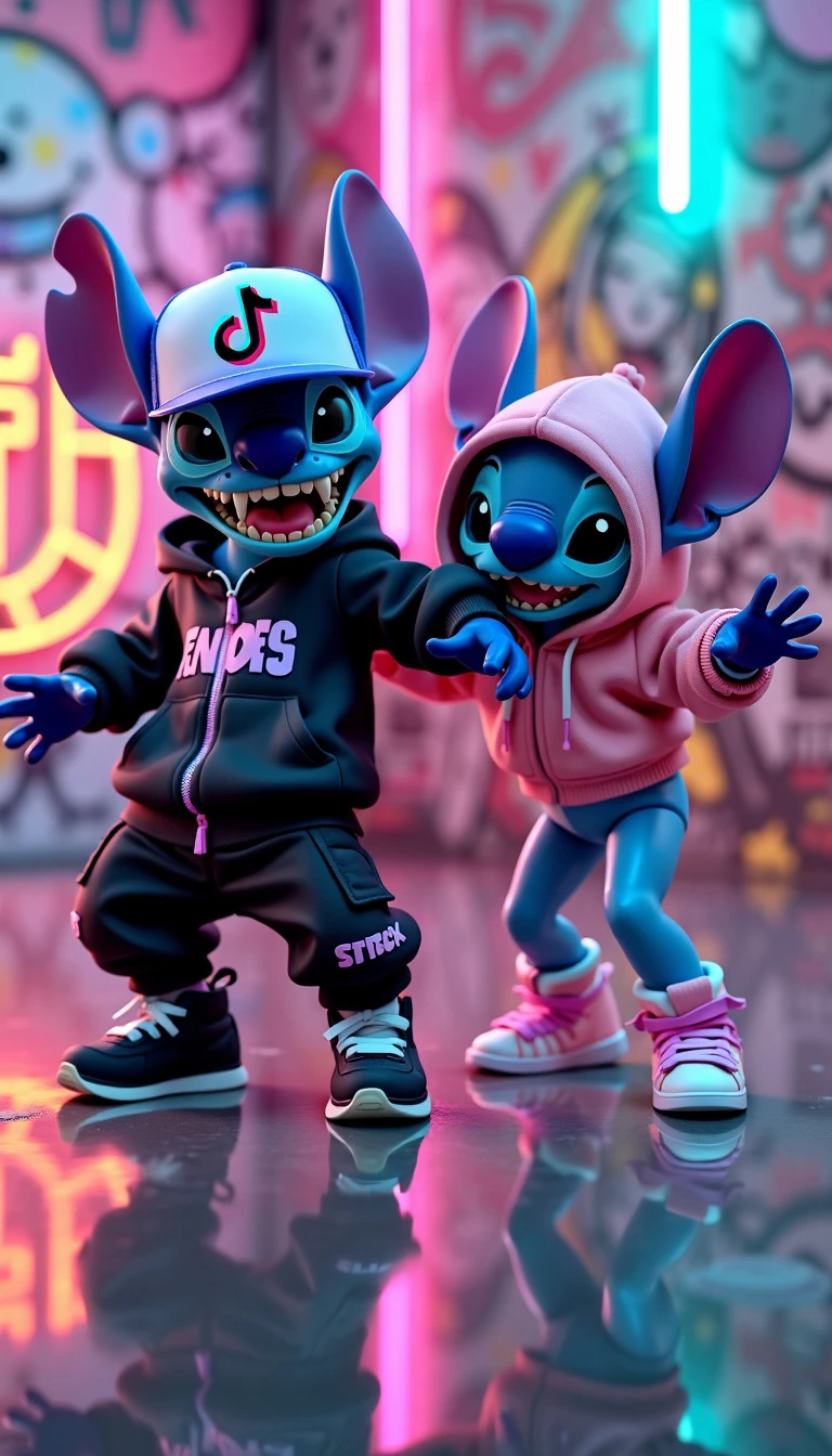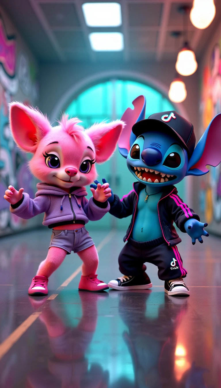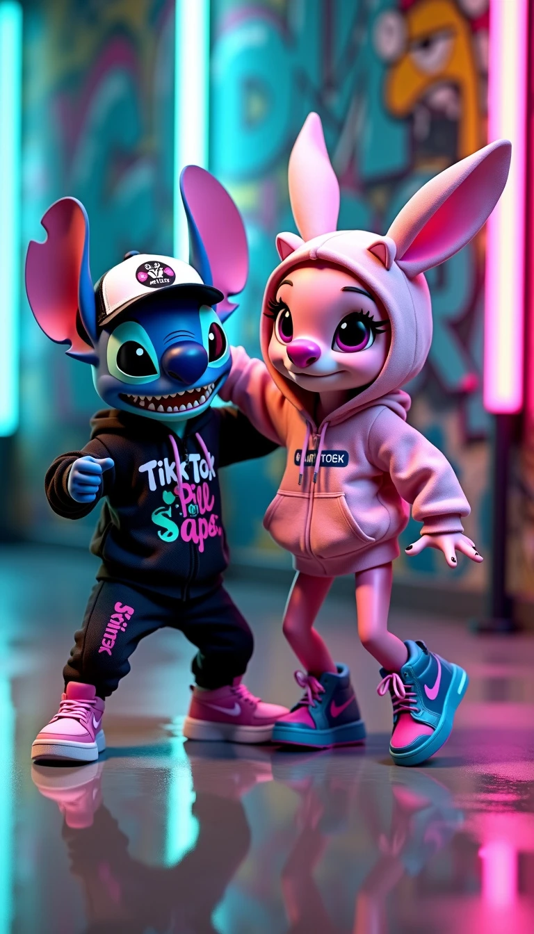 Create an **8K ultra-high-detail 3D-rendered image** featuring Stitch and **Angel (the pink version)** from *Lilo and Stitch*, both dressed in **modern urban streetwear**. Stitch is wearing a **TikTok-branded tracksuit** with **neon blue, black, and pink accents**, a **trucker hat with the TikTok logo**, and **high-top sneakers**, blending street style with a trendy vibe. His pose shows off his dance moves, as he spins in mid-motion with a mischievous expression. Angel, the **pink, fluffy character**, is dressed in **stylish, bright urban clothing**—a **cropped hoodie in soft pink with neon highlights**, paired with **fitted leggings** and **sleek sneakers**. Her outfit has modern touches of **purple and neon blue**, perfectly matching her fun, vibrant personality. She’s striking a playful, dynamic dance pose next to Stitch, with her ears bouncing as she grooves. The background is set in a **neon-lit, futuristic dance floor** with bright **color-changing lights** flashing all around. Behind them are **graffiti-covered walls** filled with bold, urban designs, giving the scene an edgy, modern street-style vibe. The **floor reflects their movements**, creating soft reflections of Stitch and Angel as they move in sync. Both characters are immersed in the energy of the moment, as if performing a viral TikTok dance challenge.