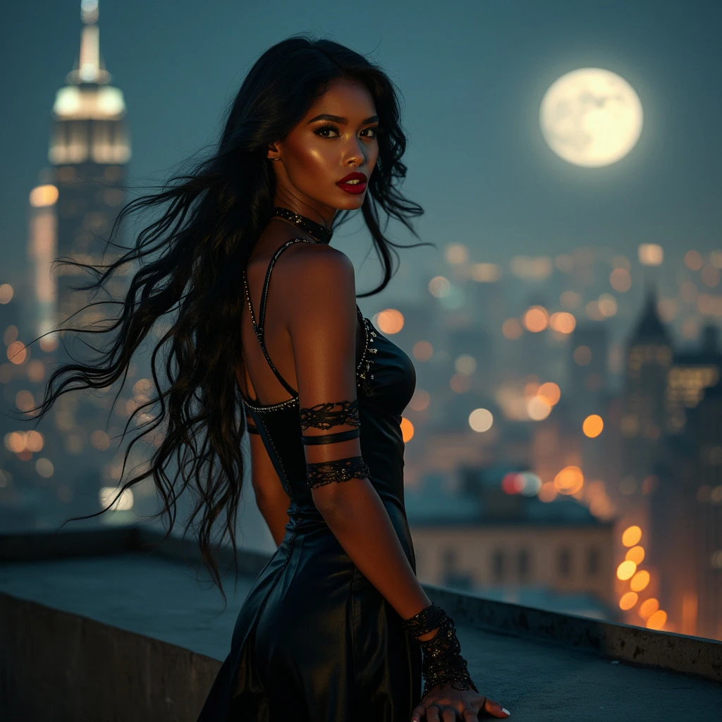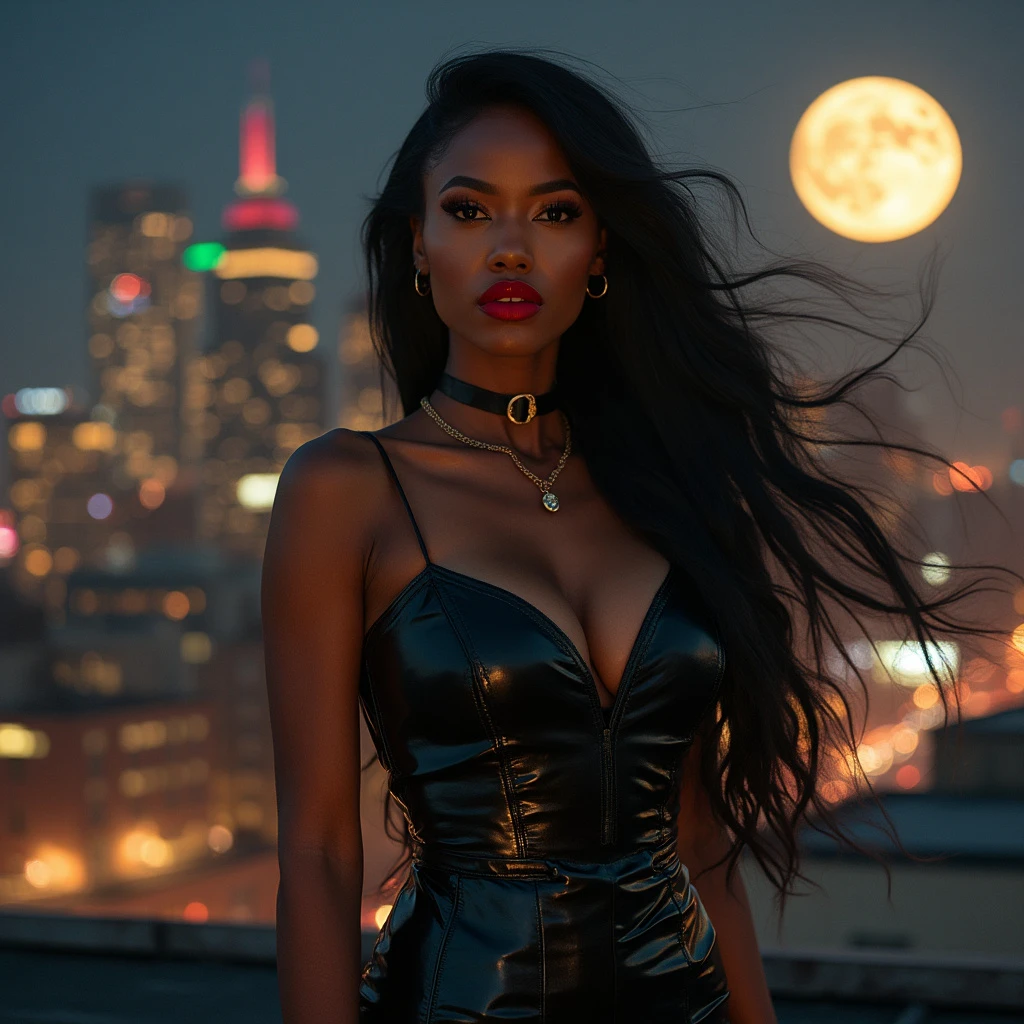 A stunning portrait photograph of a gorgeous steampunk African-American woman with an average build, wearing a sleek long black dress and bold red lipstick. Her long black hair flows elegantly as she stands on a rooftop at night, overlooking the twinkling city skyline. The full moon shines brightly in the night sky, casting a soft, ethereal glow over the scene. The image, inspired by the award-winning styles of Julia Margaret Cameron and Annie Leibovitz, captures a perfect blend of timeless beauty and cinematic atmosphere