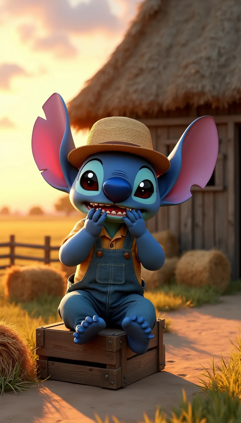 **Image Prompt:** "Create an 8k ultra-high-detail 3D rendered image of Stitch, taken back in time to the 1800s, dressed as a classic farmer. He wears worn, rustic overalls, a simple linen shirt, and a straw hat. Stitch is sitting on a wooden crate in front of an old wooden barn with a thatched roof. The barn is surrounded by a dirt path, scattered hay bales, and a vintage wooden fence. The setting sun casts a warm, golden glow on the scene. Stitch is playing a harmonica, his small hands holding it up to his mouth, eyes half-closed as he gets lost in the music. The scene captures the peaceful simplicity of the rural 1800s. The background features wide open fields, some distant trees, and the peaceful, pastoral landscape typical of the time period. The harmonica glints slightly in the light, adding a touch of detail to the quiet, nostalgic atmosphere."