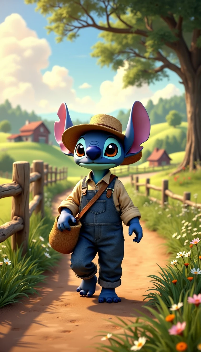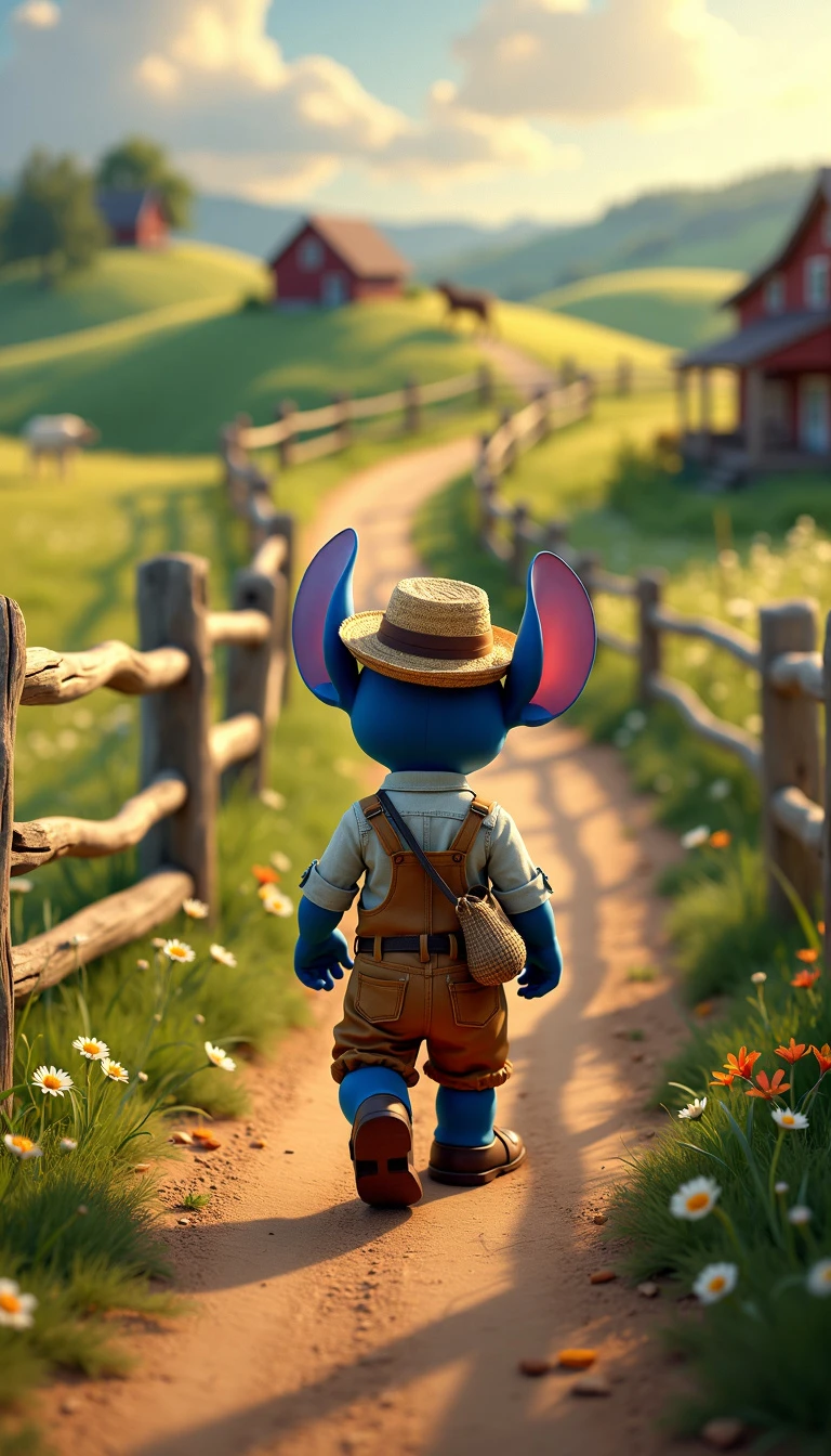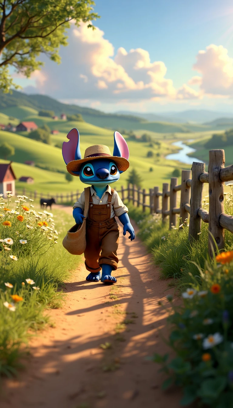 **Image Prompt:** "Generate an 8k ultra-realistic 3D rendered image of Stitch dressed in rustic 1800s farmer clothing. He is walking along a winding countryside pathway, surrounded by rolling green hills and wildflowers. Stitch wears worn overalls, a simple linen shirt, and a straw hat, carrying a small burlap sack slung over his shoulder. The dirt pathway is bordered by weathered wooden fences and stretches into the distance, leading toward a peaceful rural landscape. The soft, golden sunlight filters through the clouds, casting gentle shadows on the ground. In the background, you can see distant barns, grazing animals, and a meandering creek, giving the scene a serene, nostalgic atmosphere. Stitch's expression is thoughtful as he strolls, enjoying the quiet simplicity of the countryside."