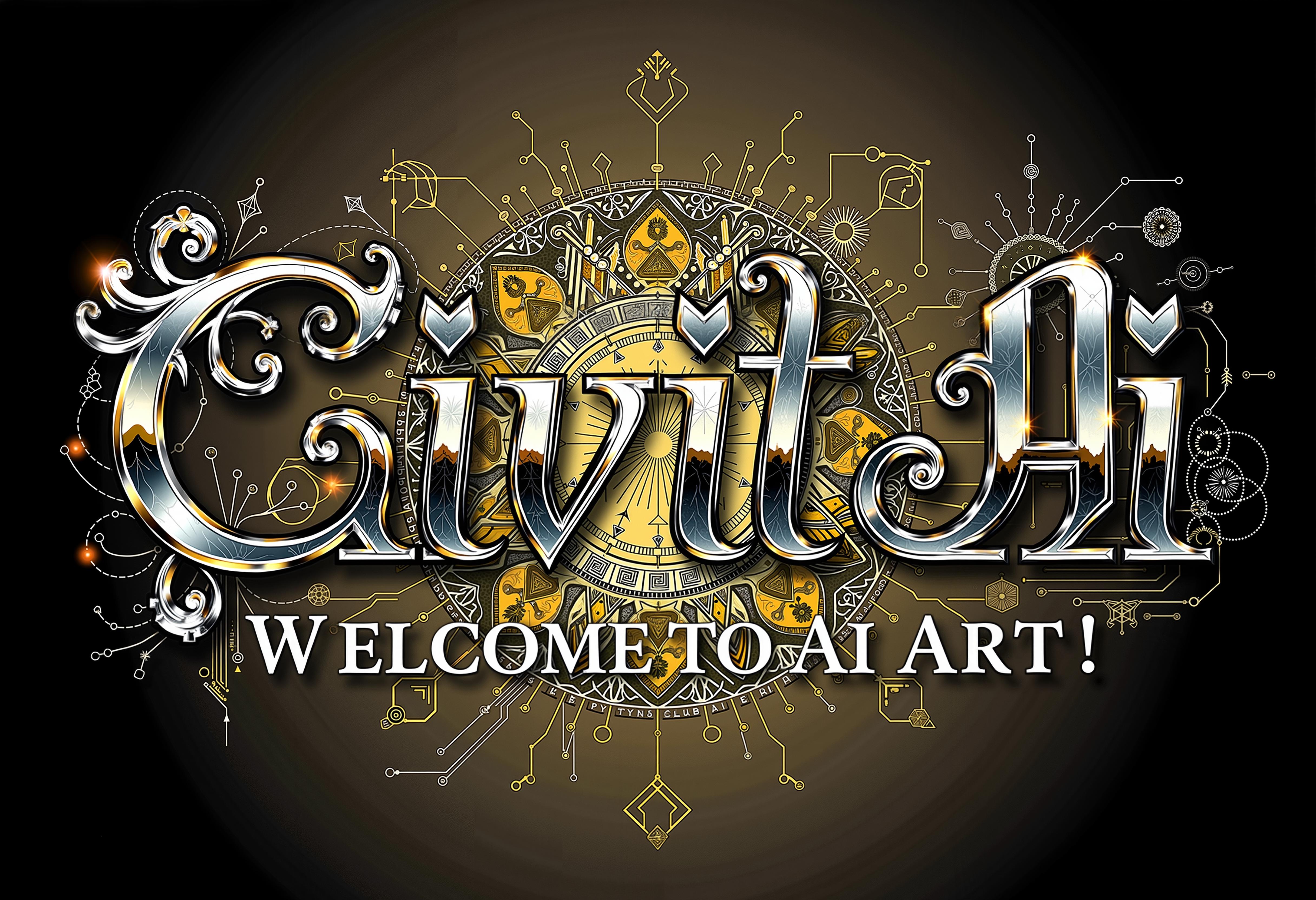 The image features an ornate and visually striking design that reads "Civit Ai" in large, elaborate metallic lettering, with a highly polished chrome-like texture reflecting warm light sources. The text style is highly decorative with baroque flourishes, intricate curls, and pointed accents that enhance its grand appearance. Behind the main text, a (((complex electronic circut inspired pattern with fine precise and accurate lines))), reminiscent of a [[mandala]] or celestial clock is rendered in golden and silver tones, filled with intricate geometric shapes, runes, and symbolic details that suggest a blend of technology and artistry. The backdrop is a dark gradient, transitioning from deep black to a warm, golden glow near the center, creating a sense of depth and highlighting the design elements. Smaller, (interconnected circuit-like accurate straight lines and nodes radiate from the central design, adding a futuristic, digital feel). Below the main title, the phrase "WELCOME TO AI ART!" is displayed in a bold, clean font, casting soft shadow and contrasting with the ornate design above, enhancing the message of modernity fused with classic elegance.