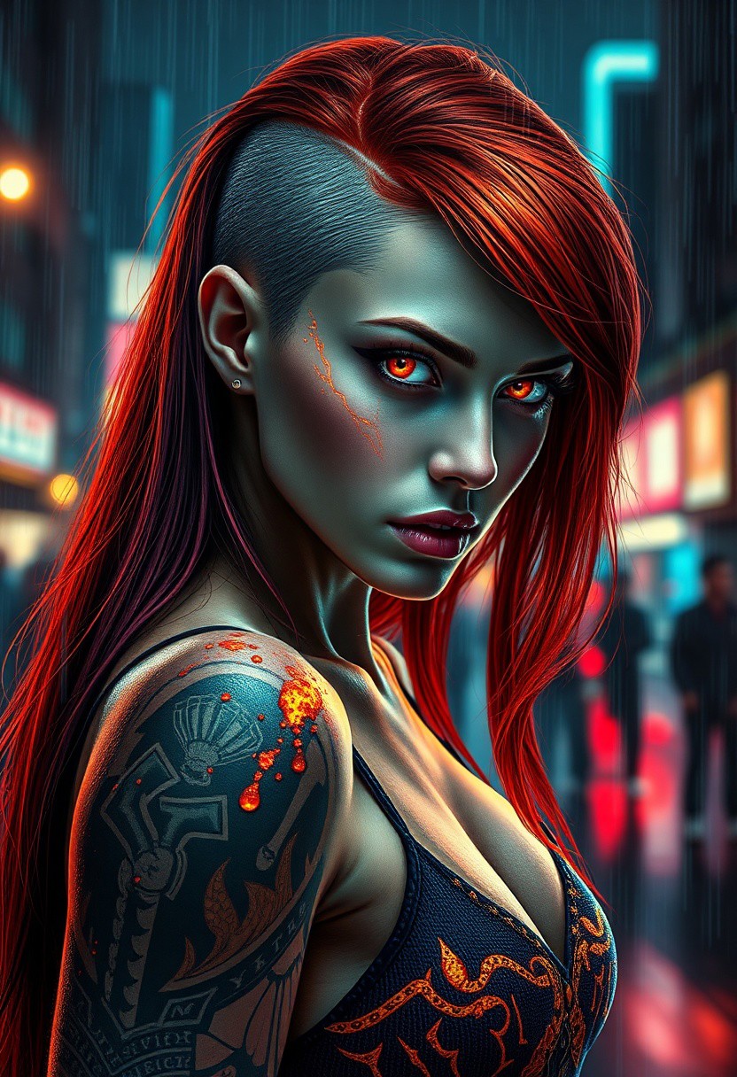 young woman, long red hair, undercut, glowing beautiful eyes, X-ray, muscular figure, tattooed arms, wearing costume, evil gaze eyes, looking at you, realistic fire, rain drop, Hyperrealistic, splash art, concept art, intricately detailed, color depth, dramatic, 2/3 face angle, side light, colorful background city, at night Epic cinematic brilliant stunning intricate meticulously detailed dramatic atmospheric maximalist digital matte painting,