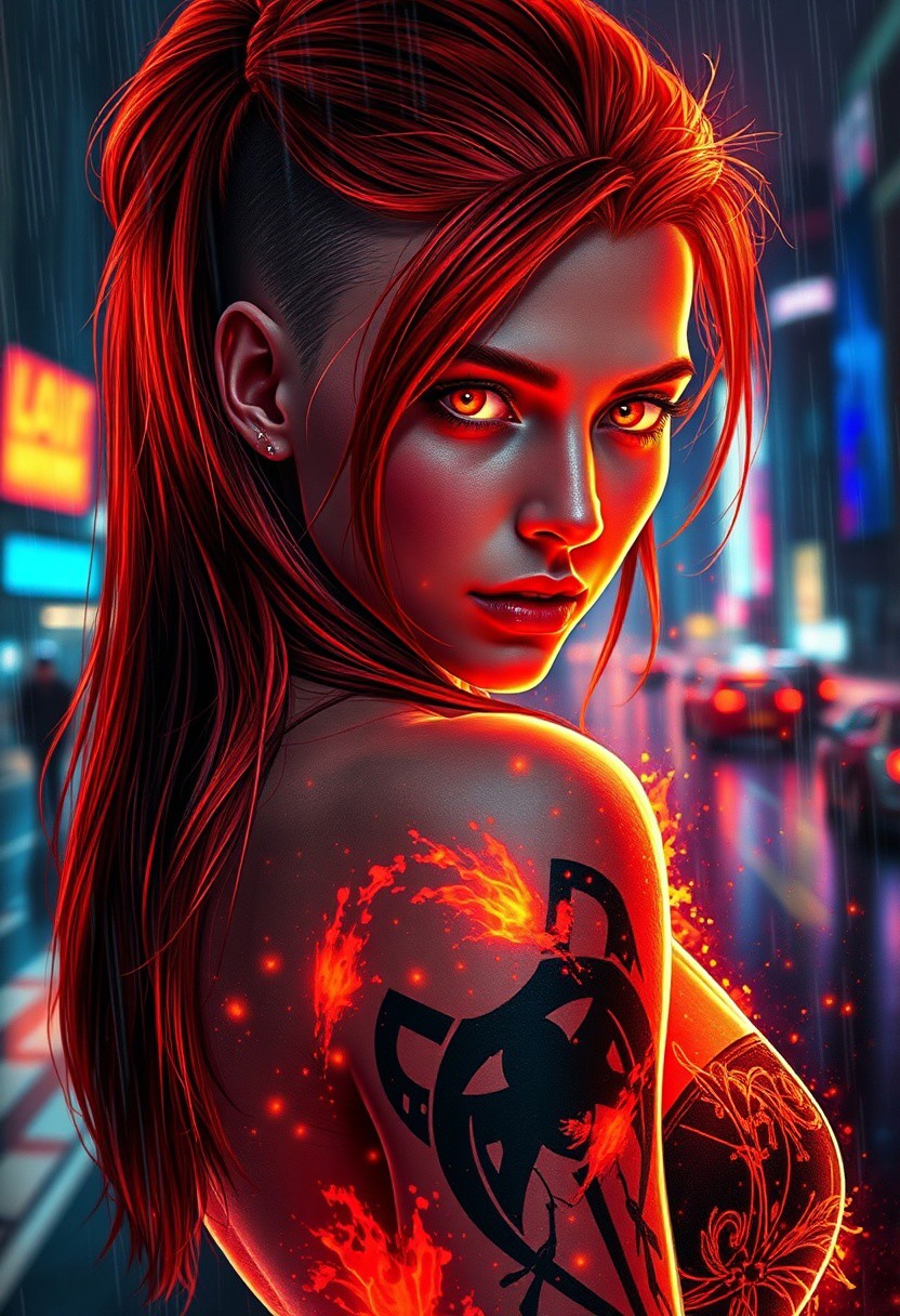 young woman, long red hair, undercut, glowing beautiful eyes, X-ray, muscular figure, tattooed arms, wearing costume, evil gaze eyes, looking at you, realistic fire, rain drop, Hyperrealistic, splash art, concept art, intricately detailed, color depth, dramatic, 2/3 face angle, side light, colorful background city, at night Epic cinematic brilliant stunning intricate meticulously detailed dramatic atmospheric maximalist digital matte painting,