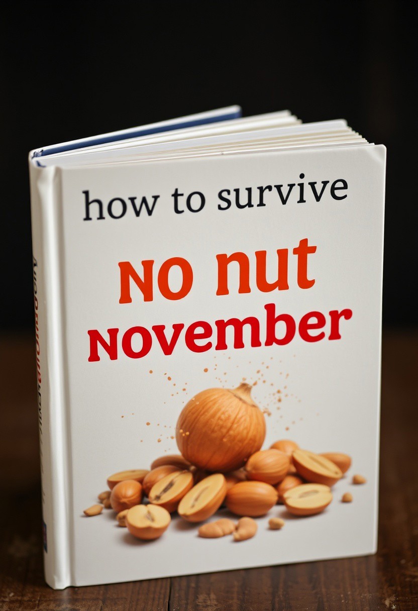a funny book with the cover 'how to survive no nut november' the cover of the book has a comedic image of nuts being smashed.