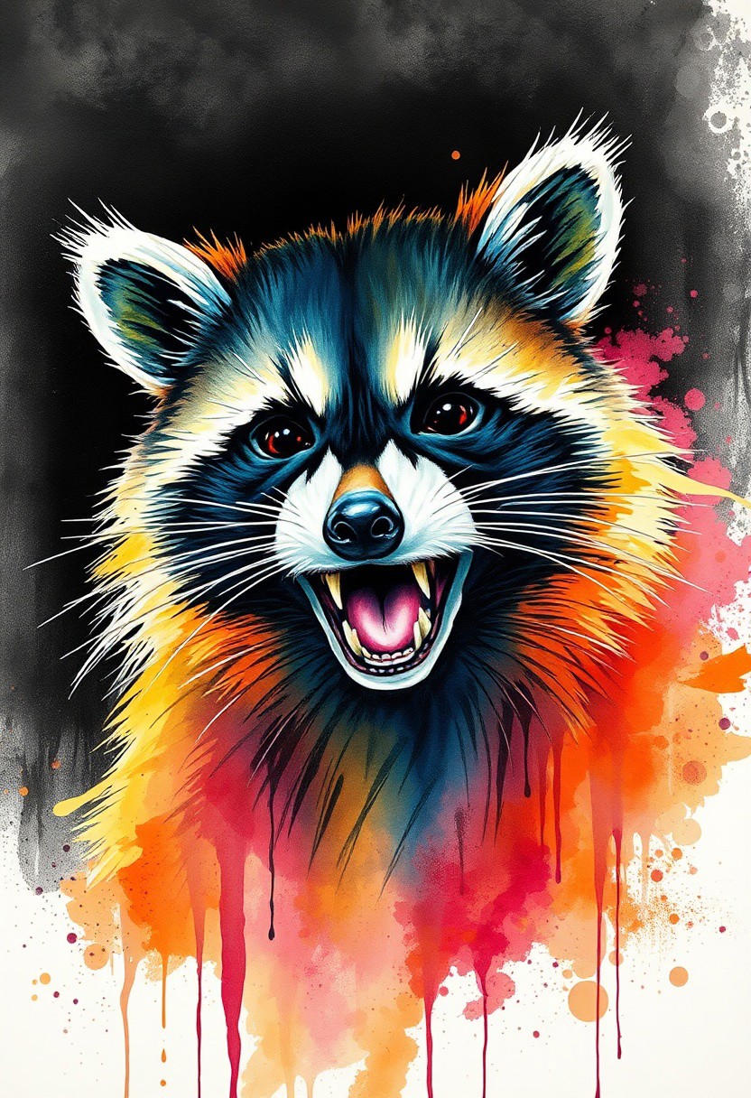 A creepy image featuring a raccoon. Really creepy, eerie, scary, spooky, but also very very silly image of a raccoon. Did I say very very silly? I meant very very very silly. Portrait. A stunning masterpiece, a mixture of watercolor, ink splash, and neon markers.