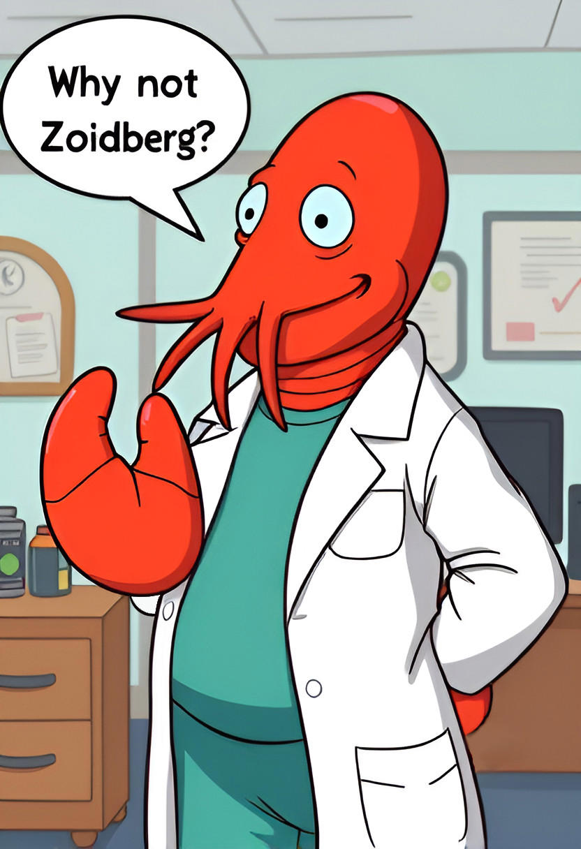 lobster, Zoidberg, anthropomorphic crab, Dr Zoidberg, Zoidberg Cthulhu face, five short thick rounded tentacles on lip, lobster-pincer oven mitt, negotiating stance contrapposto, one hand behind back, white pharmacist jacket buttoned, teal tshirt, no mouth, no nose, red-orange skin, cartoon office background, zoidberg from futurama, light blue sclera eyes, crab-pincer mittens, bald, chubby body, arm forward, speechbubble "Why not Zoidberg?"