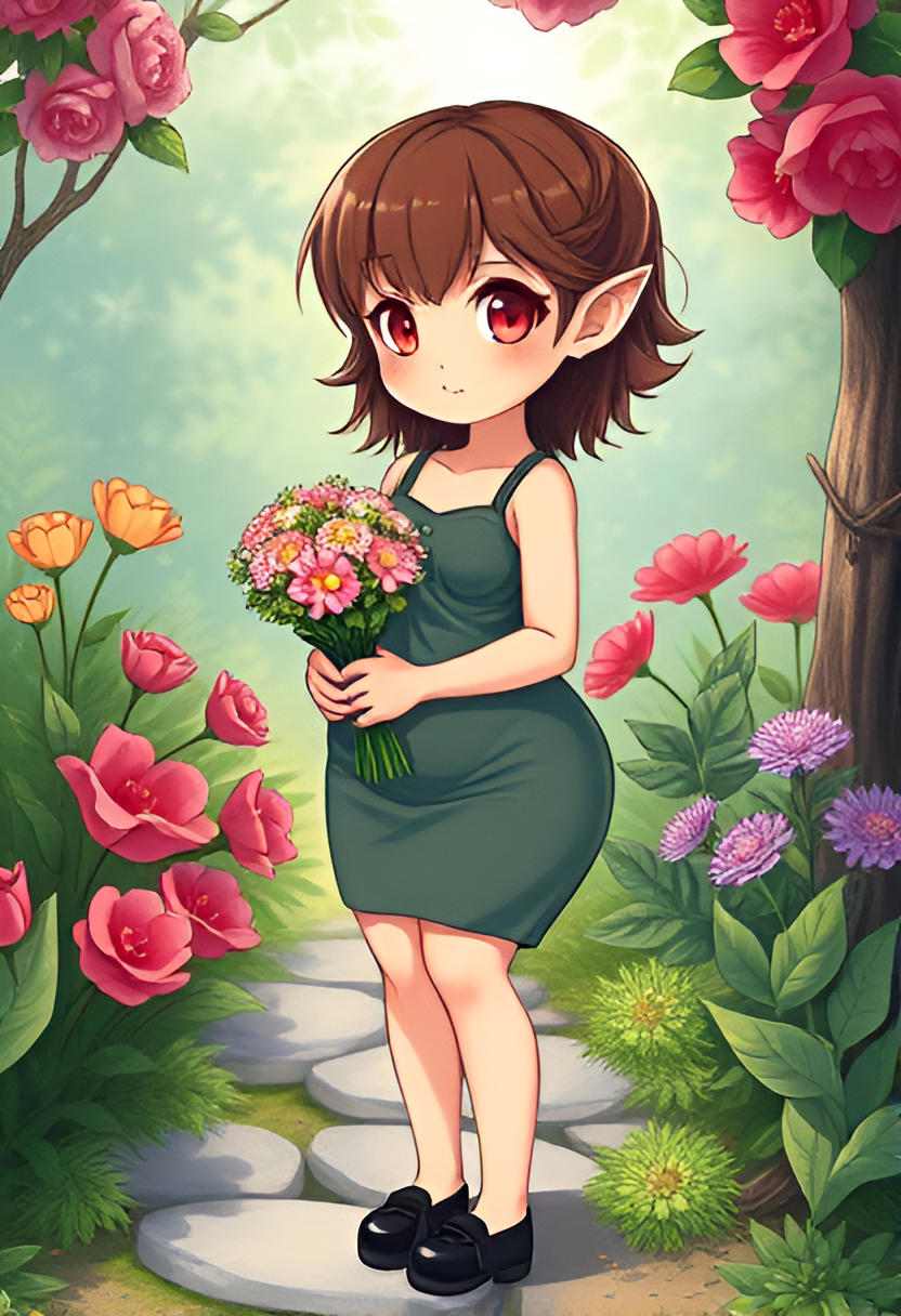 squareenix lalafell official artwork girl, lalafell girl, kawaii shortstack, extremely wide hips, pear-shaped body, vulcan halfling, pointed ears, pretty sparkling red perfect anime eyes 80s style, extremely thick thighs, brunette, small breasts, kawaii girl holding a bouquet, wearing tight grey camisole dress, colored pencil style, very short girl, view from slightly above, masterwork stylized anime art, eye contact, short girl in a very tight dress, chubby petite, outdoors, adorable, extremely attractive, thick very wide hips, very chubby legs, plump big butt, black shoes, baroque bold colors, outdoors garden photo referenced, detailed matte painting style background, very wide hips, medium-long green whimsical-style skinny dress, daytime, standing facing viewer at slight angle