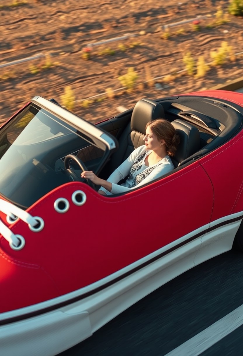 A car that looks like a giant sneaker. convertible car, (((the body looks like the rubber sole of a sneaker))), eyelets and shoe-laces A woman driving the car, Red canvas Vans_Authentic sneaker, detailed sneaker, perfect sneaker, (((visible full car))), (((the entire car is visible)))