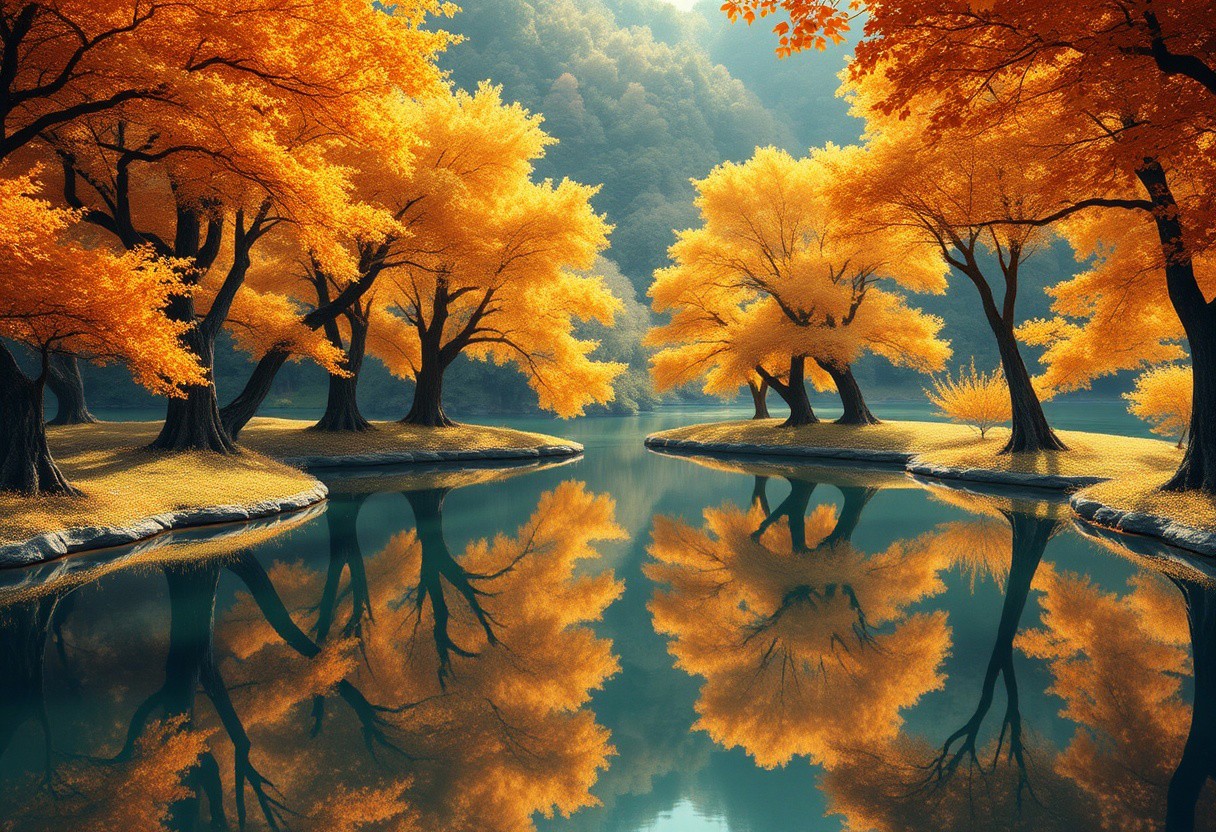 Stunning detail reflection of golden and orange katsura trees around a natural round lake, autumn, realistic, wide shot, art style of Studio Ghibli, magical, whimsical atmosphere, vibrant colors, beautifully lit, serene landscape