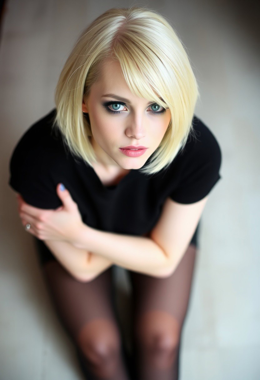 woman, blonde bobcut hair, parted half hair, green and blue eyes, eyeliner, gothic, wearing black t-shirt and black hotpants, black pantyhose