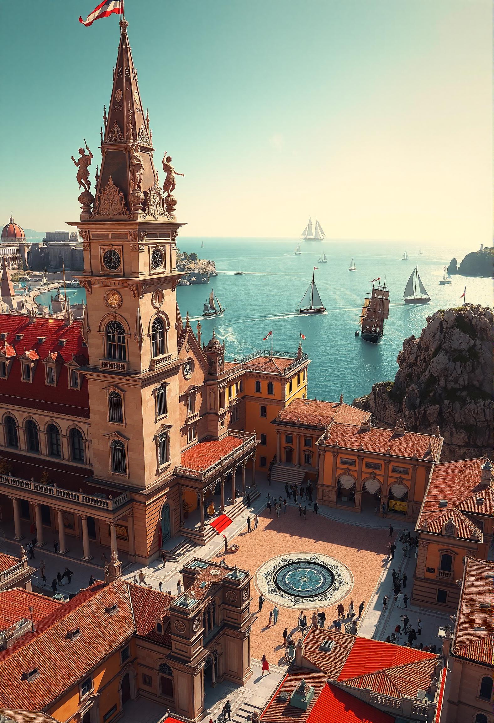 breathtaking The image presents a grand, sunlit cityscape dominated by towering, intricately designed buildings that blend Renaissance and Baroque architectural styles. The central towers, adorned with detailed frescoes and elaborate stonework, rise majestically above the bustling city square below, casting long, dramatic shadows that add depth to the scene. The rooftops are topped with gleaming, pointed spires, and their façades feature large, arched windows and decorative columns. The vibrant square is filled with people, adding life and movement, as they traverse the cobblestone pathways or gather in small groups. Beyond the city, a serene, turquoise bay stretches into the distance, dotted with sailboats and small vessels navigating through the calm waters, which reflect the sunlight with a soft, shimmering glow. Rugged cliffs and rocky formations frame the bay, creating a dramatic natural backdrop that contrasts beautifully with the refined architecture of the city. The entire setting is bathed in warm daylight, enhancing the golden hues of the stone buildings and the vibrant blue of the water, creating a picturesque and idyllic atmosphere reminiscent of a fantasy or historical setting. . award-winning, professional, highly detailed
