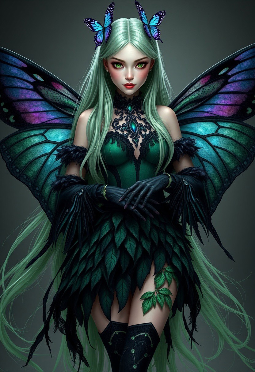 Fantasy fairy woman with long, flowing mint-green hair cascading past waist. Large, bright green eyes. Pale, luminous skin. Two pairs of large, translucent butterfly wings with intricate blue and pink vein patterns. Ornate outfit combining dark and emerald green: High-necked black lace collar adorned with small blue butterflies Fitted bodice in emerald green with a sweetheart neckline, overlaid with sheer black fabric Sleeves made of layered black feathers from shoulder to elbow Long black gloves extending past elbows, decorated with emerald green leaf patterns Lower body attire: High-cut emerald green leotard base Asymmetrical overskirt: shorter on right, longer on left, made of layered black and emerald green fabric with tattered, feather-like edges Thigh-high black boots with pointed toes, adorned with emerald green leaf motifs Accessories: Two large, iridescent blue and purple butterflies perched in hair above ears Delicate silver jewelry with emerald accents around neck and wrists Overall aesthetic: Ethereal and slightly dark, blending natural elements with an otherworldly fairy appearance.