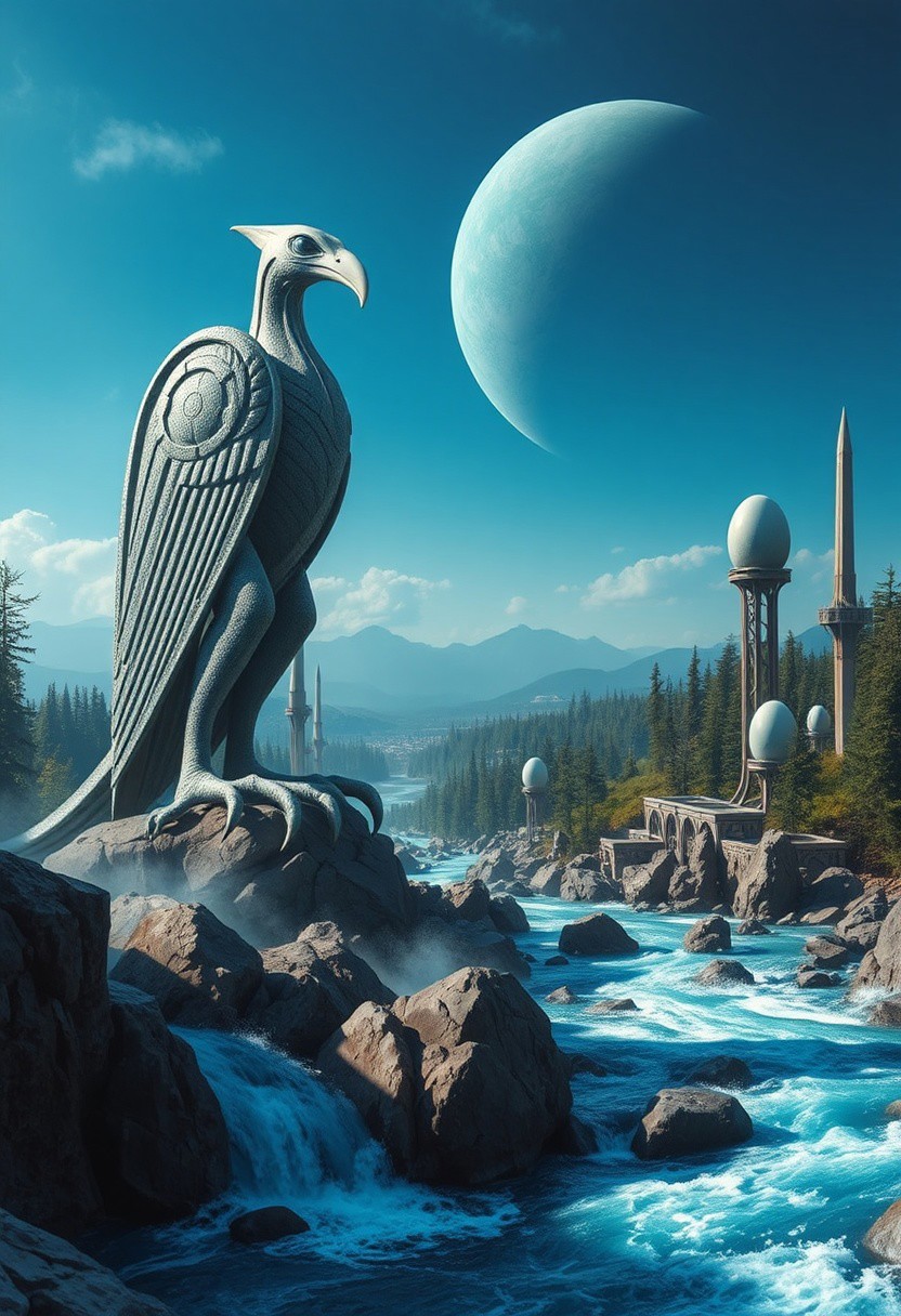 a giant alien, avian statue, its clawed feet astride a fast flowing blue river with spray rising from jagged rocks, guards a valley. In the near distance several structures, tall narrow spires topped with large egg shaped crystal houses. On the horizon a giant ringed planet, its atmosphere a swirl of blues and greens, rises over an alien forest