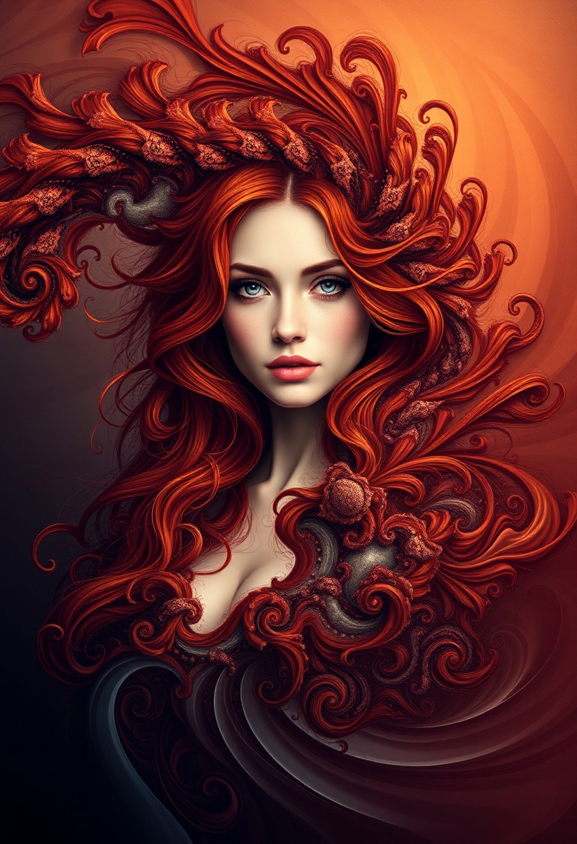generate fractals swirling combining into a beautiful redhead woman