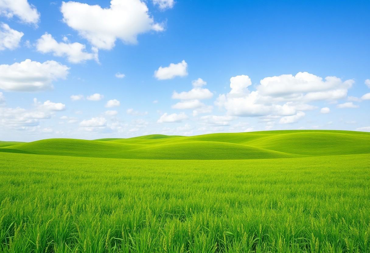 lush green field, iconic rolling hills, bright and vibrant green grass stretching far into the horizon, blue sky with scattered fluffy clouds, clear and sunny day, high-resolution, ultra-realistic textures, serene and peaceful atmosphere, vast open landscape, soft gentle slopes, minimalistic yet beautiful, perfect symmetry in nature, tranquil and calming mood, (blurry details:-1.6), (overexposed lighting:-1.5), (dull colors:-1.5), (flat composition:-1.4), (urban elements:-1.6)