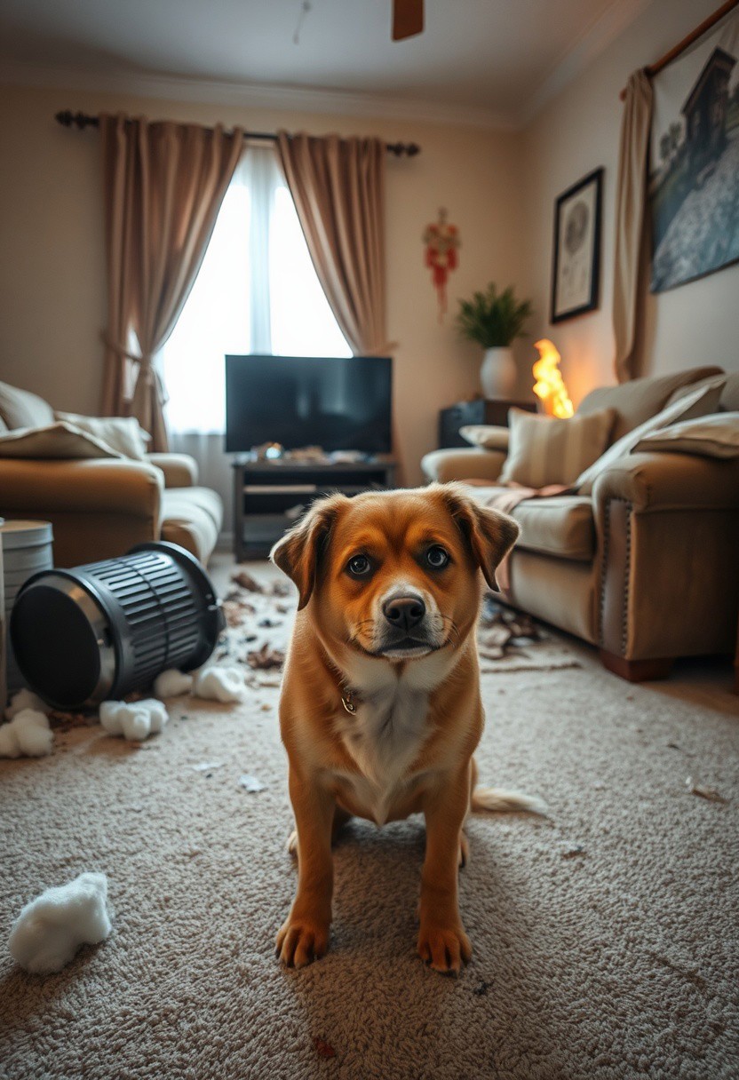 iphone photo of an embarrassed young dog looking at the floor to avoid eye contact knowing it just disobeyed, behind the dog we can see a living room with the sofa and armchairs torn open, fluffy pillow stuffing scattered around, shattered tv set fallen to the ground, dirty smears on the walls, flipped garbage can with litter on the carpet, torn window curtains and a small fire in a corner