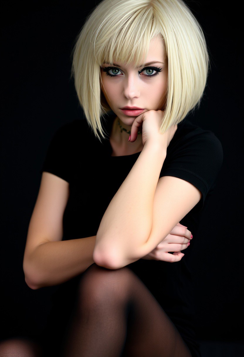 woman, blonde bobcut hair, parted half hair, green and blue eyes, eyeliner, gothic, wearing black t-shirt and black hotpants, black pantyhose