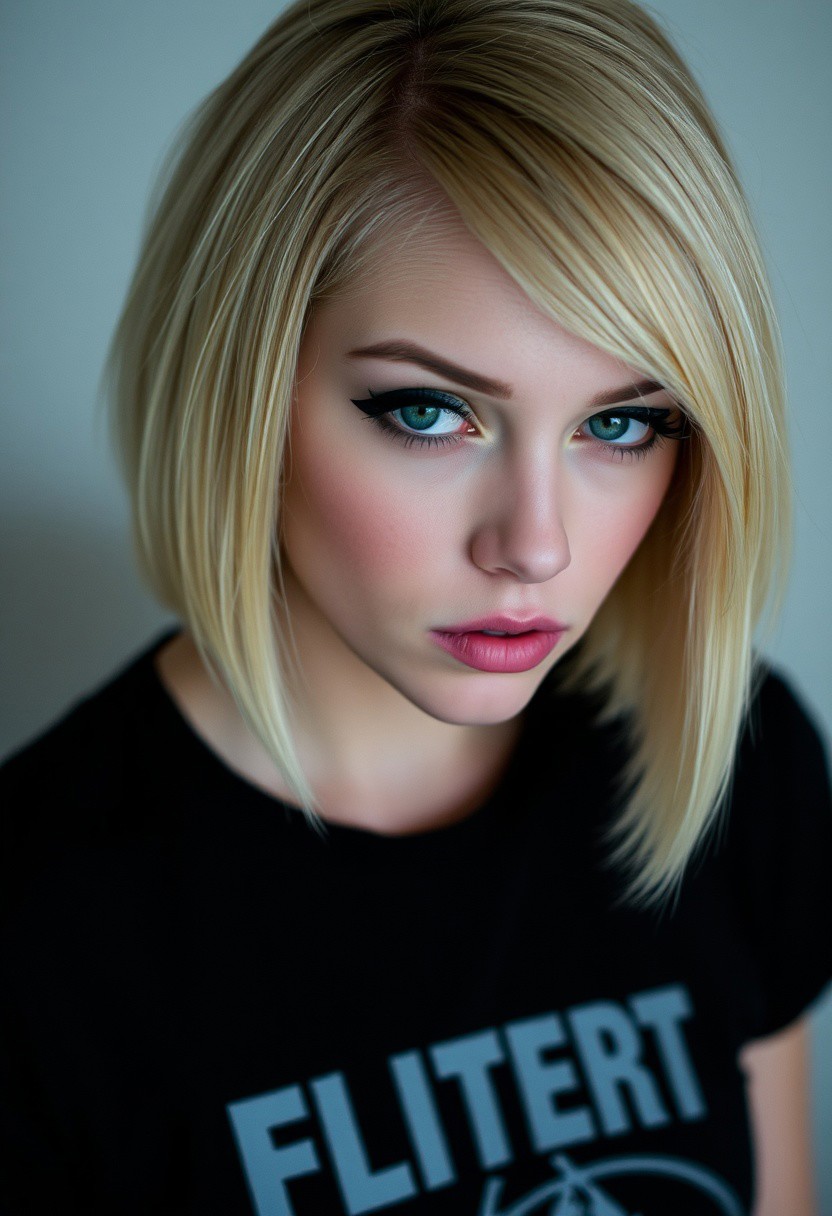 woman, blonde bobcut hair, parted half hair, green and blue eyes, eyeliner, gothic, wearing black t-shirt,