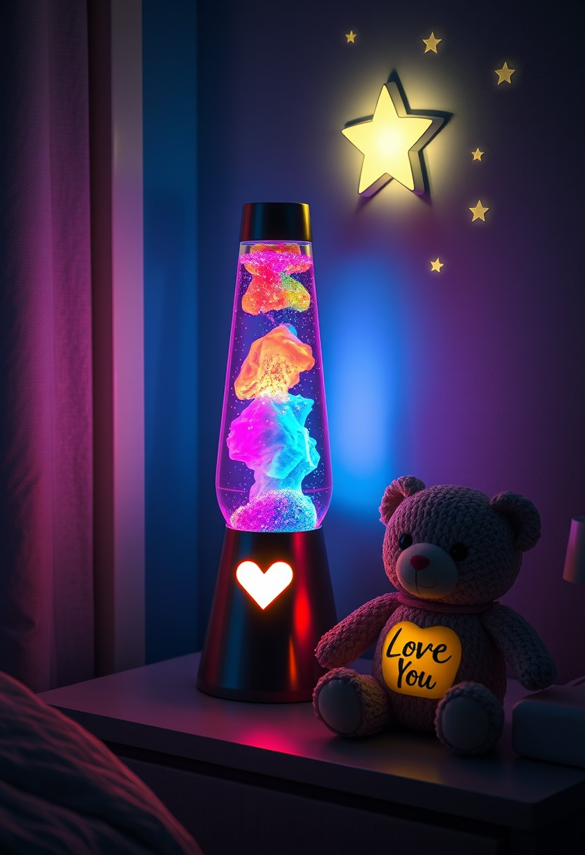 "Create a hyper-realistic image of a colorful lava lamp on a nightstand in a dark room. The lamp is lit, with vibrant, swirling liquids and glittering particles suspended in a mesmerizing dance. On the wall, a nightlight projects tiny, five-pointed shooting stars, adding to the cozy ambiance. Next to the lamp, a small teddy bear sits with a glowing heart-shaped light on its chest, displaying the phrase 'Love You' in a sweet, cursive script. The lamp's soft glow, the bear's gentle light, and the starry nightlight projection bring joy and comfort to the dark room, creating a peaceful atmosphere." Octane render, Highest-Quality, 8 k, intricate details, visually stunning, Masterpiece