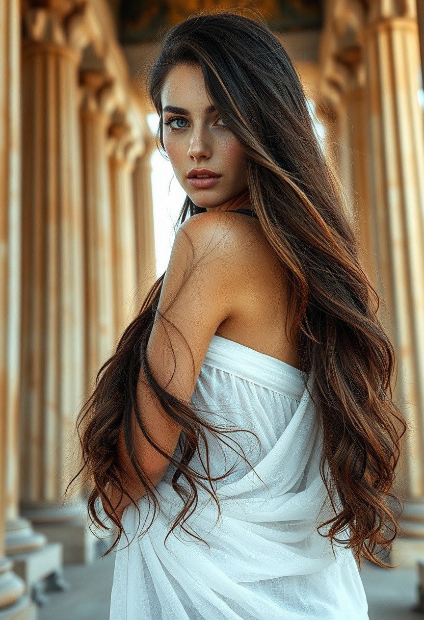 Masterpiece best quality, score_9_up, score_8_up, score_7_up, score_6_up, hd, high definition, highly detailed, high resolution, high res, high quality, fine texture, intricate, professional photo of a stunningly beautiful goddess standing seductively in a Greek temple with her long flowing brunette hair covering her breasts, gauzy white gown, no_makeup, beautiful hazel eyes, delicate features, long neck, curvy hips, tiny waist, hourglass, round ass, bubble butt sticking up, slender, closed mouth, full lips kissing, glowing light radiating from face and body, white backlight, erotic, sensual, orgasmic, making eye contact with the viewer