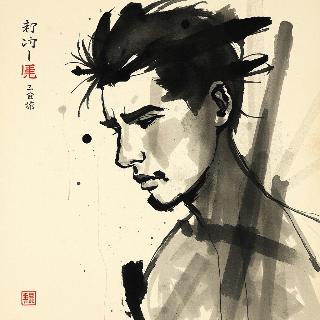 墨汚粗筆古紙 ink stains - rough brush - aged paper. Male nude. Sumi-e ink wash painting by Jackson Pollock.