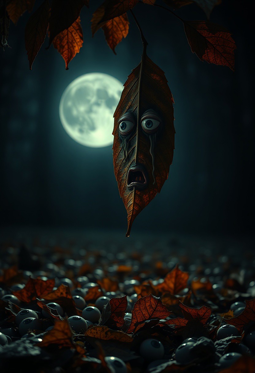UHD 32k dark comedy movie still, photograph, closeup portrait of surreal dark shadowed anthropomorphic autumn leaf with eyes and mouths crying dangling from a branch looking sick, below on the ground there are many brown leaves on the ground with dead eyes, night solely lit by eerie light from one full moon, very detailed and photorealistic, shadows, gritty texture.