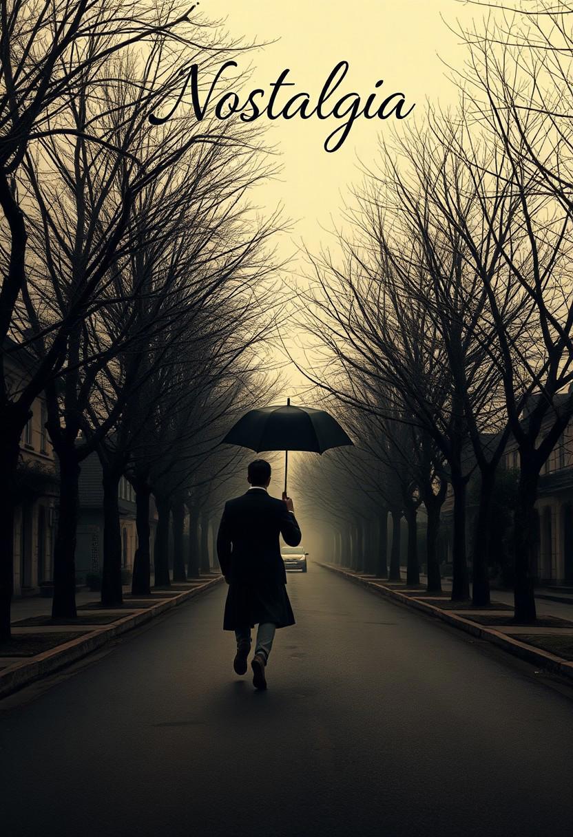 A couple walks along a quiet street lined with old, bare trees. They share one umbrella, walking slowly, their shadows stretching behind them. The dim light of dusk casts a golden hue over the scene. The word "Nostalgia" is written in a soft, flowing script at the top.