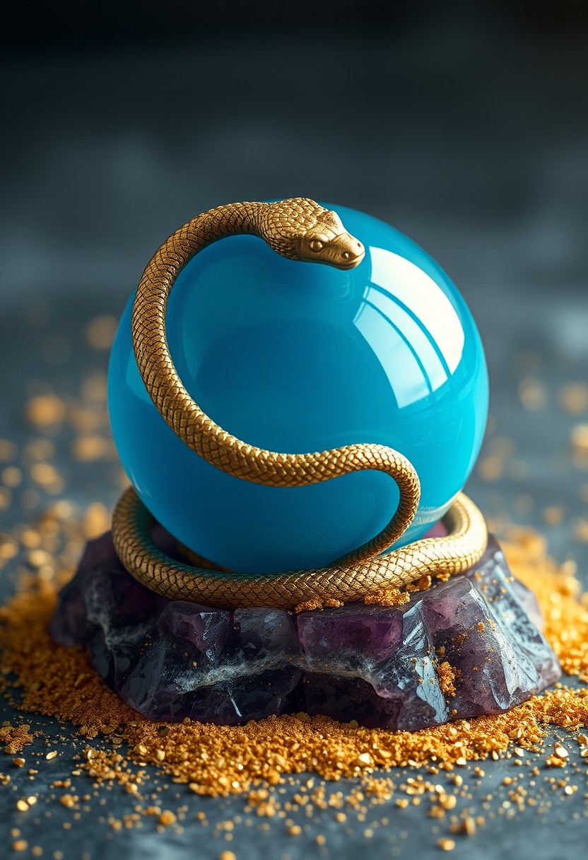 "Create a hyper-realistic image of a miniature cyan orb, its surface smooth and translucent, with a delicate serpent carved into its surface. The serpent's body wraps around the orb, its scales and texture intricately detailed. The orb is nestled in a pile of gold dust, which sparkles and shimmers in the light. The orb is placed on a gemstone platform, expertly crafted from a deep, rich amethyst, the purple hue complementing the orb perfectly. The overall effect is one of ancient, mystical power and beauty, with the serpent adding a sense of mystery and intrigue." Octane render, Highest-Quality, 8 k, intricate details, visually stunning, Masterpiece