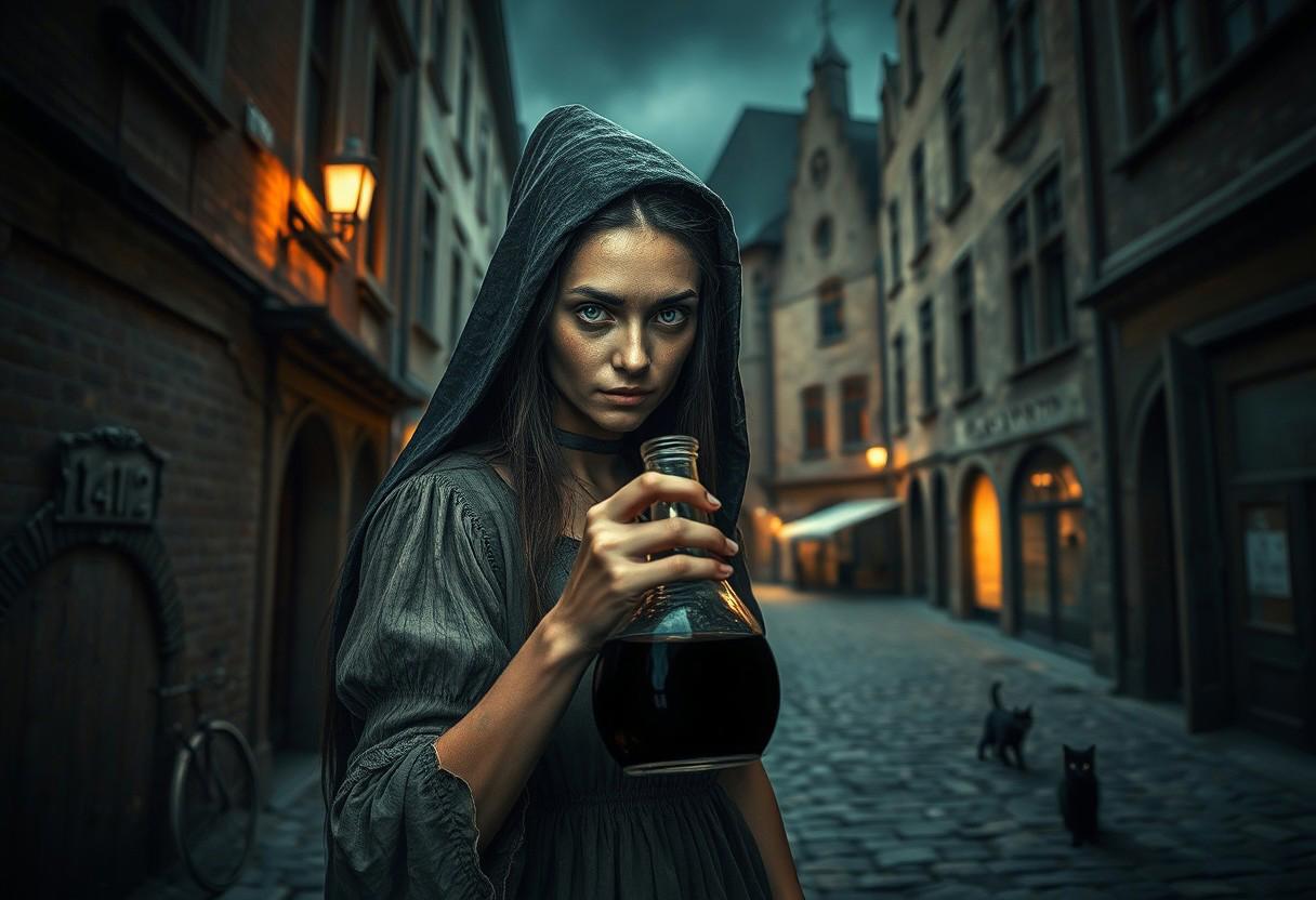 picture of a witch, the witch has a beautiful face, face is dirty, eyes are transparent and dark, clothing is worn, she is wearing a summer dress, dress is dirty, witch is standing in an alley between two historic buildings, in front of the buildings is an empty market place, the witch is hiding in the shadows, the year is 1412, it is night, a cat can be seen in the distance, the witch is holding a transparent flask, the black liquid content of the flask is glowing, spooky scenery, the pictures has a mystic look and feel