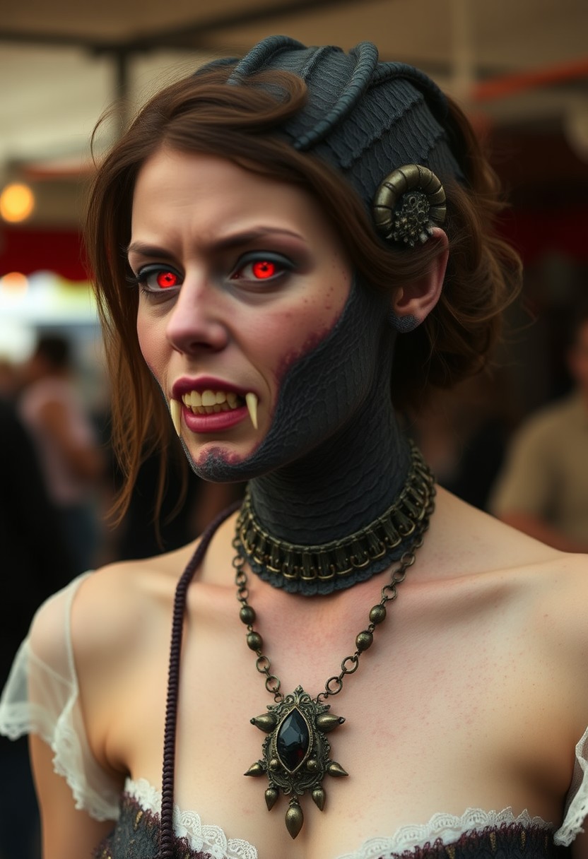 “The Cursed Necklace”: A woman finds an antique necklace at a flea market and decides to wear it. As she puts it on, her body begins to morph into a horrifying creature with scales, fangs, and glowing red eyes. The transformation is both beautiful and terrifying, as the necklace’s curse takes hold.