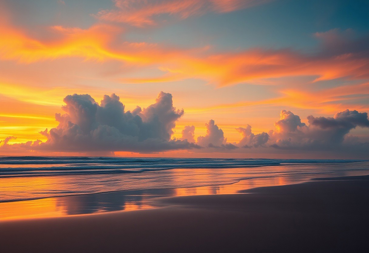 Dramatic clouds rolling in from the sea, casting shadows over a beach at sunrise, vibrant hues of orange painting the sky, hyperrealistic landscape, cinematic lighting, detailed textures, masterpiece digital painting by Ivan Aivazovsky and Claude Monet, 8k resolution, tranquil atmosphere, beautiful scenery.