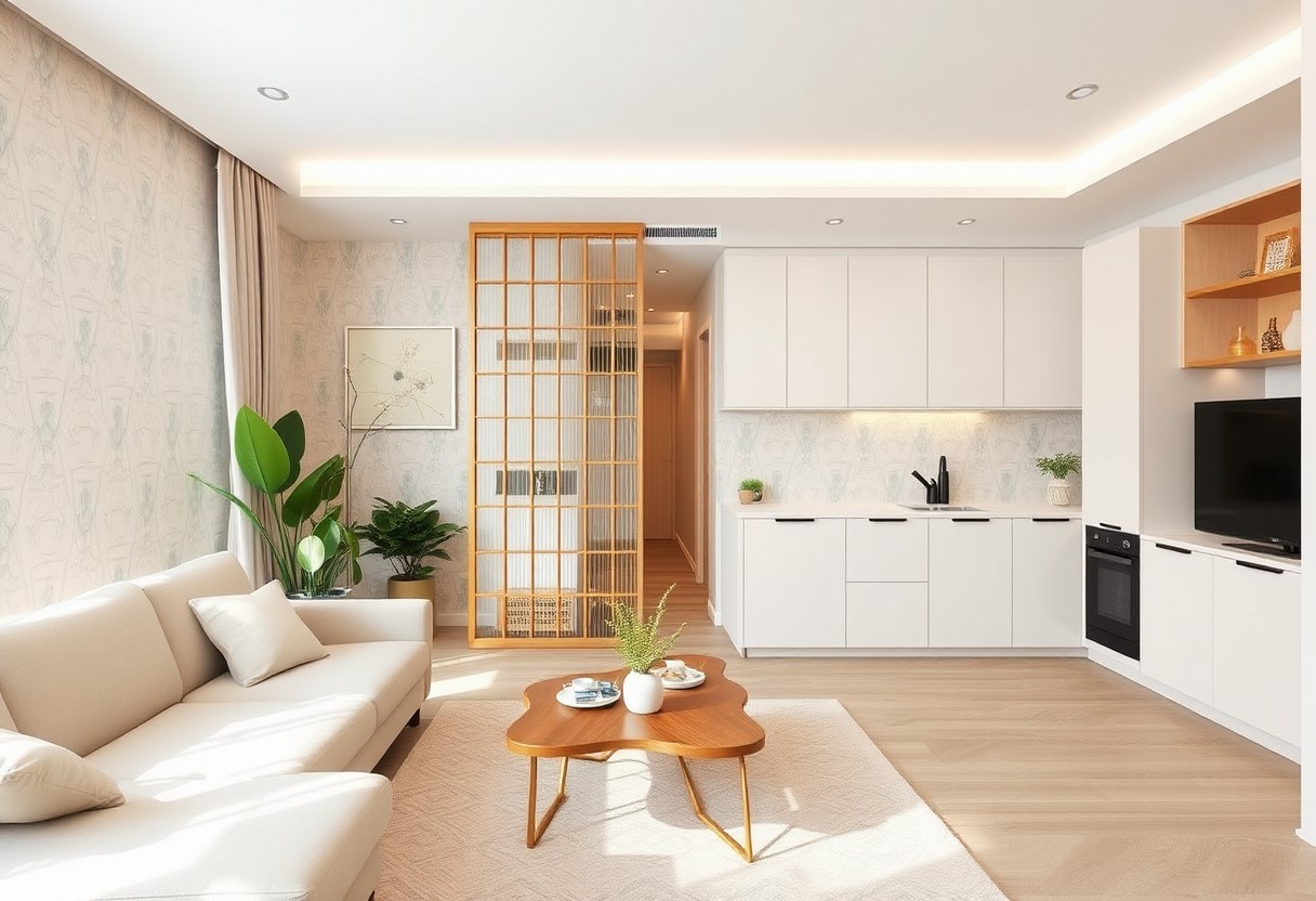 Design a 36m² apartment that blends modern Japanese, Indonesian/Javanese, and Scandinavian styles. The living room includes compact, space-saving modern furniture, such as a minimalist sofa and sleek, multi-functional coffee table. Scandinavian textures, like light-toned matte finishes and clean, smooth surfaces, replace wood textures. The walls feature pastel modern art-inspired wallpaper with geometric designs. The kitchen has pastel-colored cabinetry with Scandinavian minimalist finishes and integrated storage solutions. A shoji-style partition with Javanese batik patterns separates the areas. The decor includes sleek Scandinavian elements, indoor plants, and a three-color pastel palette of light neutral tones, soft off-white, and pastel accents like mint or blush