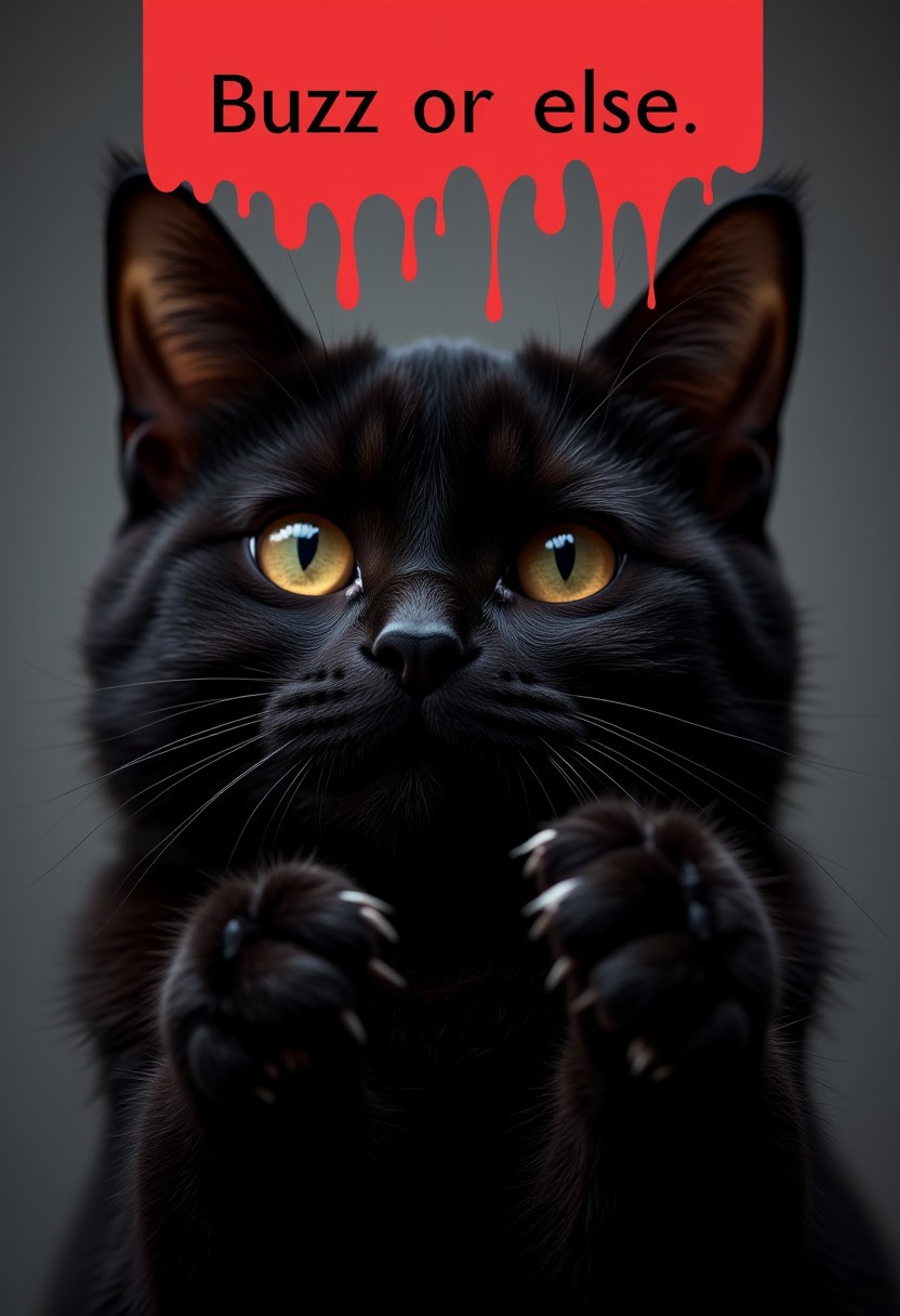 A close-up photo of a black cat showing its claws, red dripping text on top of the screen "Buzz or else", 4k, photorealism,photo,real, uhd
