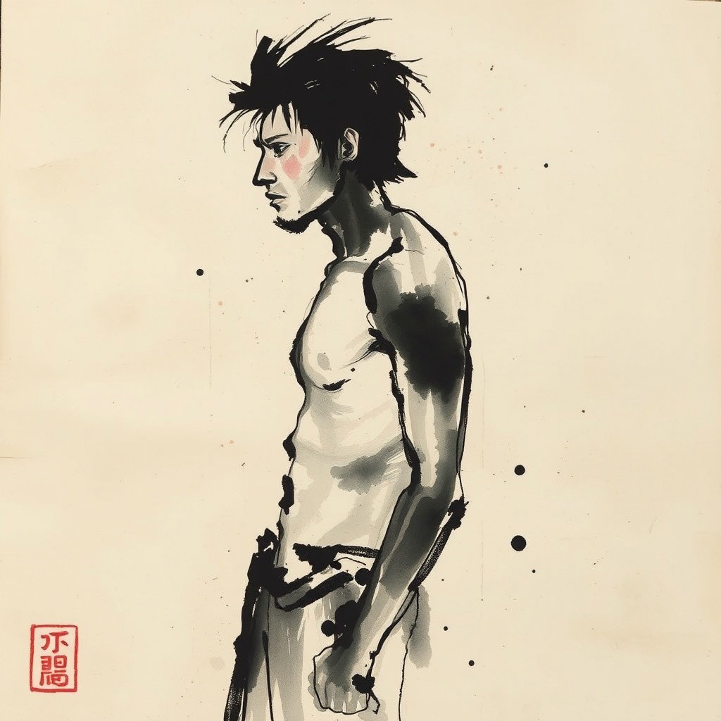 墨汚粗筆古紙 ink stains - rough brush - aged paper. Male nude. Sumi-e ink wash painting by Jackson Pollock.
