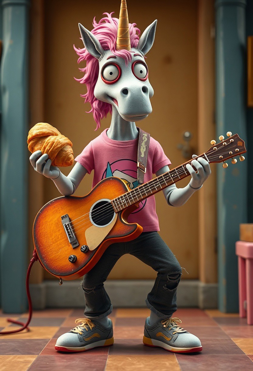 a weird Peruvian dvd that is a mix of cel animation, claymation, early CGI, and live-action, a creepy CGI man in a pink unicorn t-shirt holds a guitar in one hand, and a Croissant in the other,
