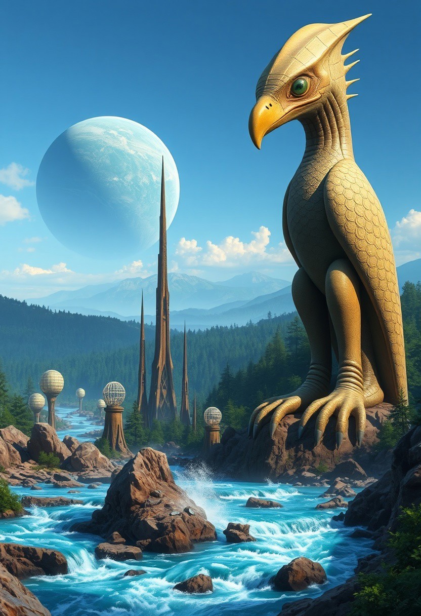a giant alien, avian statue, with a sharp beak and eagle eyes, its clawed feet astride a fast flowing blue river with spray rising from jagged rocks, guards a valley. In the near distance several structures, tall narrow spires topped with large egg shaped crystal houses. On the horizon a giant ringed planet, its atmosphere a swirl of blues and greens, rises over an alien forest
