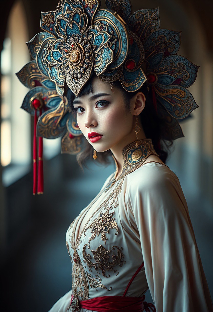 (Soft Lighting Photography by Mimoza Veliu and Mario Giacomelli:1.2), NSFW, (off-center composition, dynamic left aligned composition), BaroCybPnk, Futuristic, Baroque, Cyberpunk, Photography, cinematic, The image is a portrait of a young woman wearing a futuristic-looking headpiece. The headpiece is made up of a large, ornate headdress with intricate designs and patterns in shades of blue, red, and gold. The woman's face is turned to the side, with a serious expression. She is wearing a long, flowing dress with a high neckline and long sleeves. The dress is decorated with gold and red accents, and the bodice is covered in intricate patterns and designs., cinematic film still anime artwork fantasy art by Kouta Hirano, sci-fi art by Kunio Okawara, , Mecha design, Gundam, intricate, futuristic, action-packed, dark fantasy, intricate, detailed . anime style, key visual, vibrant, studio anime, highly detailed . shallow depth of field, vignette, highly detailed, high budget, bokeh, cinemascope, moody, epic, gorgeous, film grain, grainy, sexy
