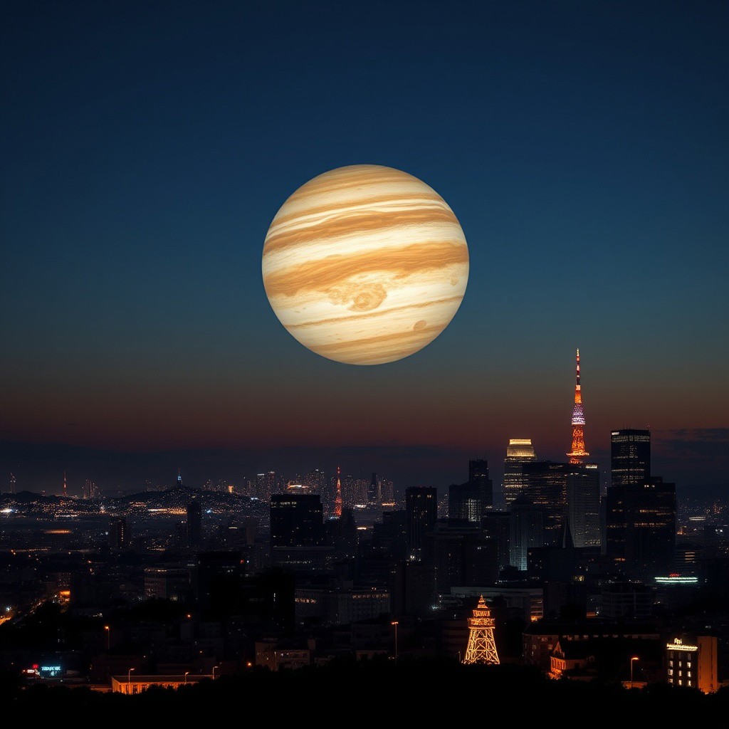 a photorealistic picture of a San Francisco night skyline with a huge Jupiter planet in the sky