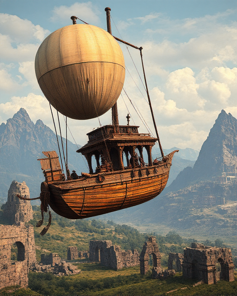 a hyperrealistic image with extreme details of a wooden airship with a balloon, in a steampunk world. The wooden airship is flying over ancient ruins. In the background there is a jagged mountain with a steampunk city on the side displaying an airship dock. The airship is captained by a beautiful steampunk woman.