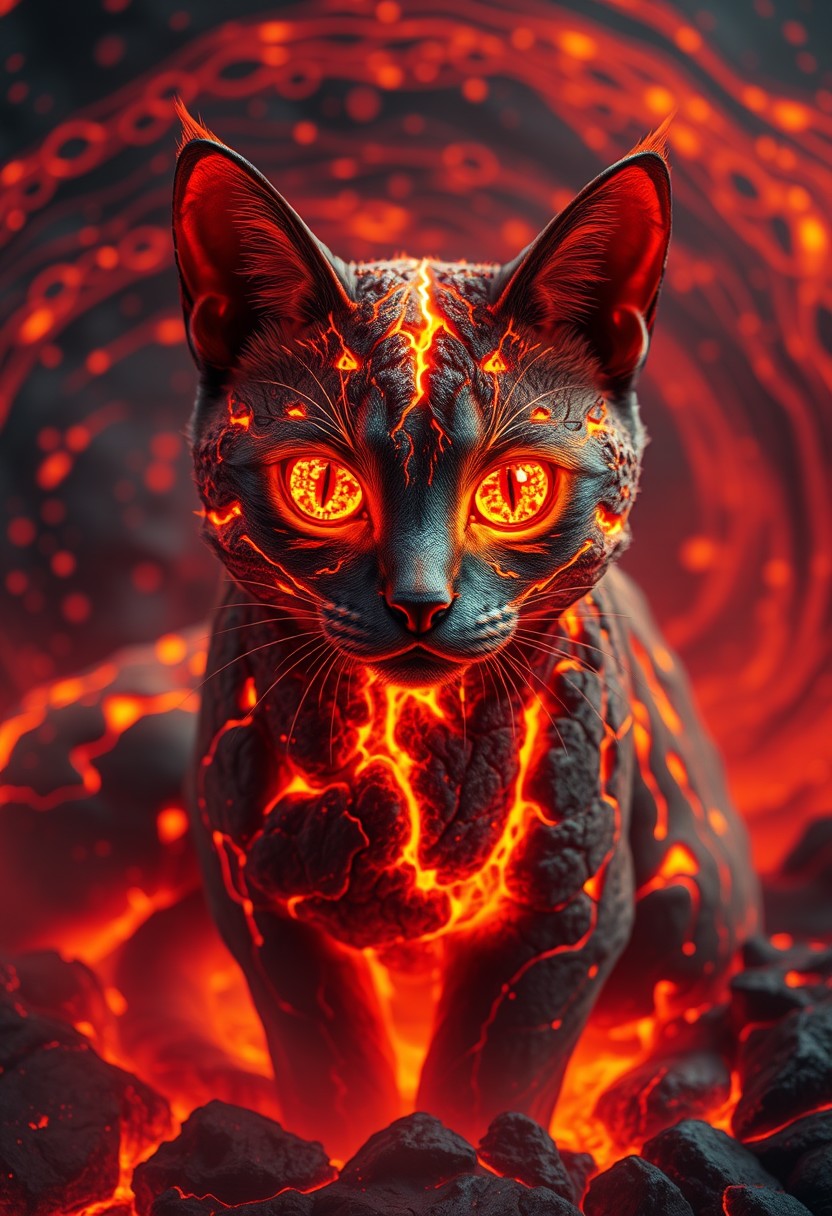 "Create a photorealistic image of a cat made from molten lava, with fissures on its body glowing with an intense, fiery light. Magma drips from its body, as if the cat is slowly melting into a pool of liquid fire. The eyes are gorgeous and radiant, with a beautiful pattern of glowing embers and molten rock swirling around them, creating a sense of depth and dimension. The overall effect is one of breathtaking, fiery wonder. The image should be surrounded by a swirling vortex of magma bubbles, as if the cat is emerging from a sea of molten lava. The bubbles should be rendered in exquisite detail, with subtle texture and movement, adding to the sense of energy and dynamism. The image should capture the intricate details of the molten lava, with a sense of movement and flow." Highest-Quality, 4k, intricate details, visually stunning, Masterpiece