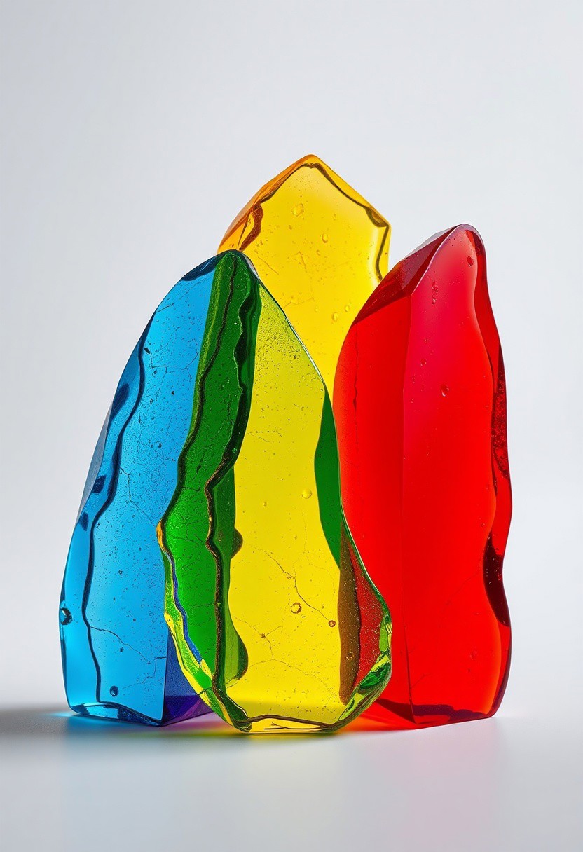 "Create a hyper-realistic image of three distinct pieces of colored glass, each with a unique hue and texture. The pieces are positioned in a way that their sides partially overlap, creating a fascinating display of color theory in action. Where the red and yellow glass overlap, a vibrant orange hue is created. Where the blue and yellow glass overlap, a bright green hue is formed. And where the blue and red glass overlap, a deep purple hue emerges. The glass pieces are rendered in exquisite detail, with every facet and imperfection visible, and the overlapping colors blend seamlessly together to create a stunning visual effect." highest-Quality, 8 k, intricate details, visually stunning, Masterpiece