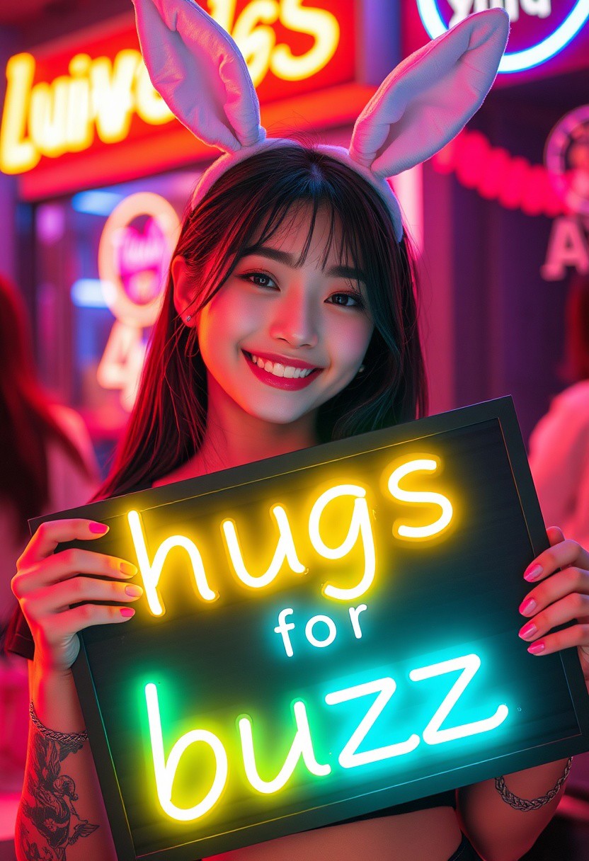 digital art, young korean woman holds neon board with text "hugs for buzz", cute, night club, neon, beautiful, tattoos, kawaii, perfect face, smile, bunny ears