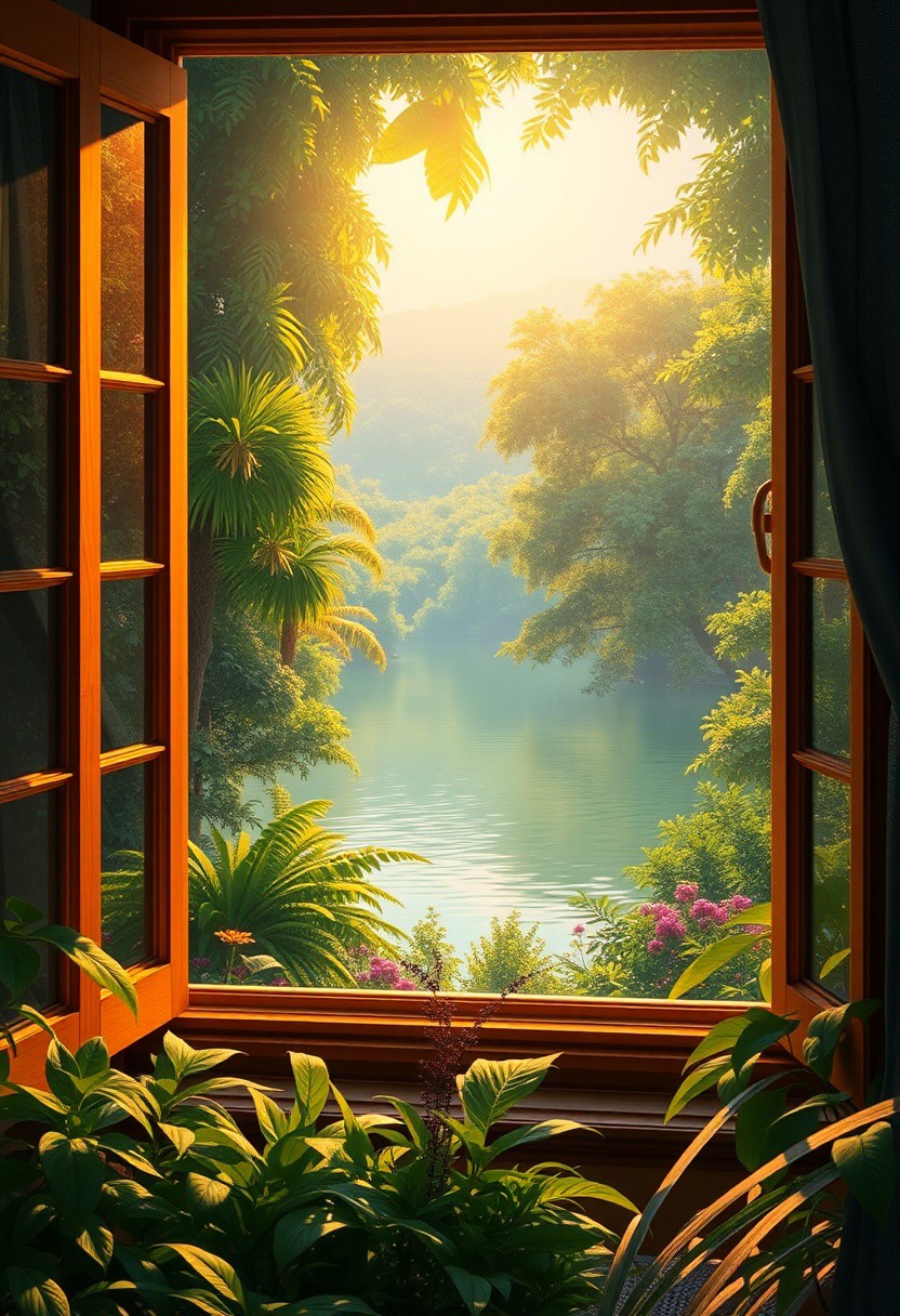 Cozy home window scene overlooking a vibrant jungle with a serene lake, warm natural lighting, highly detailed, photorealistic, digital painting, lush greenery, tranquil atmosphere, by Thomas Kinkade and Eyvind Earle, 4k resolution, masterpiece